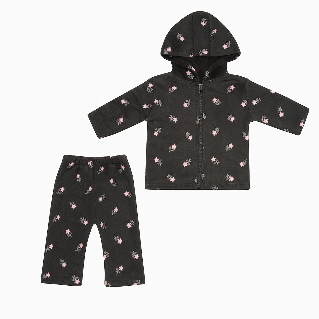 This adorable baby winter set includes a cozy hooded top and matching pants made from ultra-soft velvet fabric. The light pink color gives it a cute and charming look, while the warm inner lining ensures comfort during cold days. The hoodie comes with a stylish black drawstring for a trendy touch. Perfect for keeping your little one warm and snug all winter long.