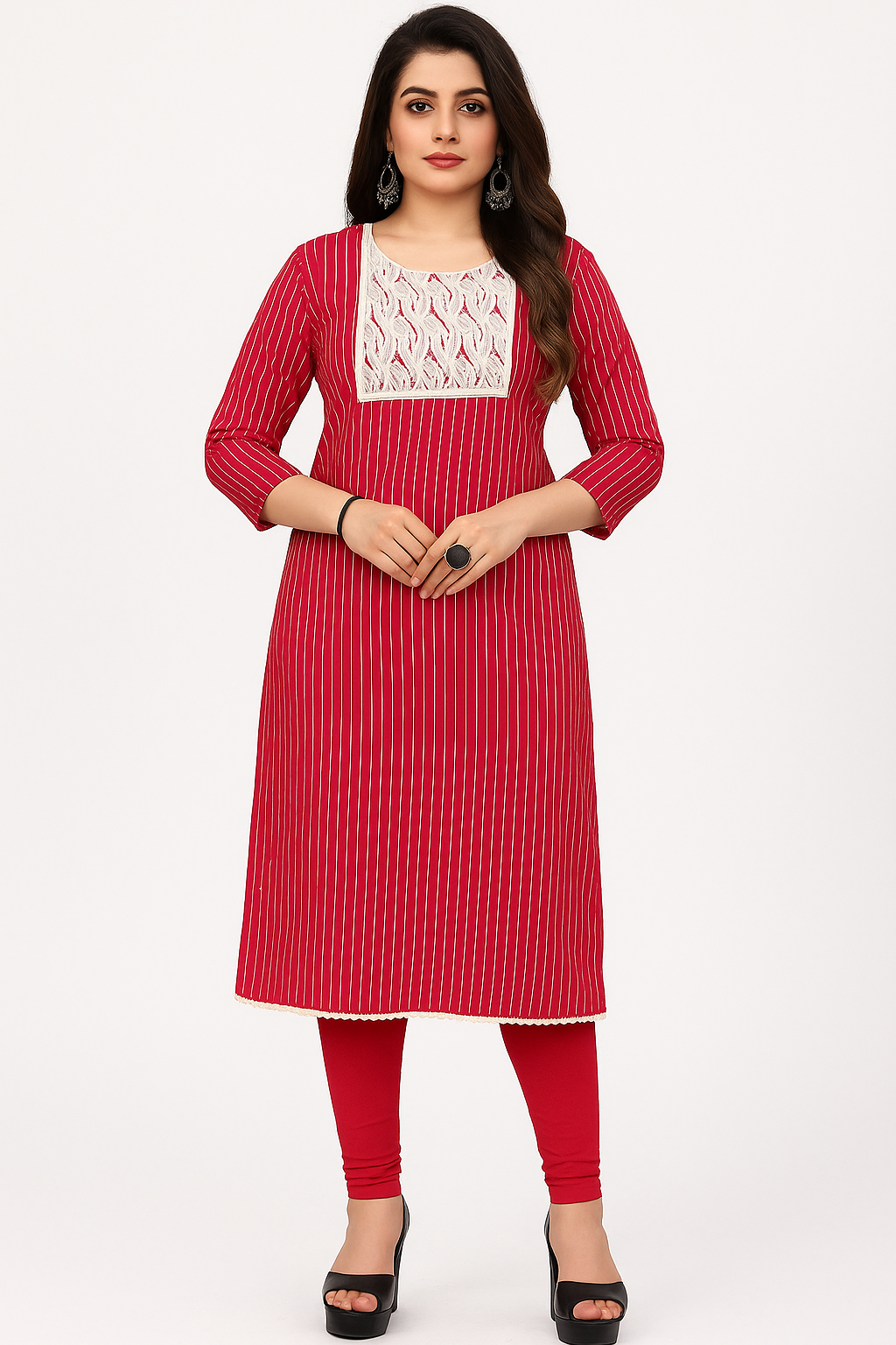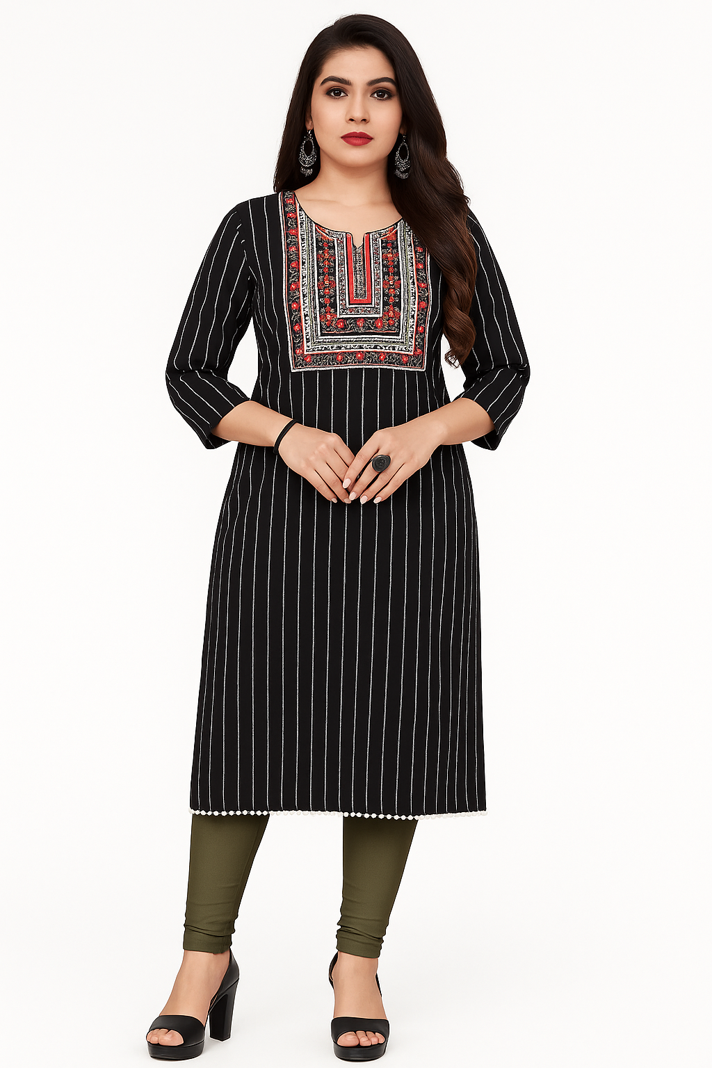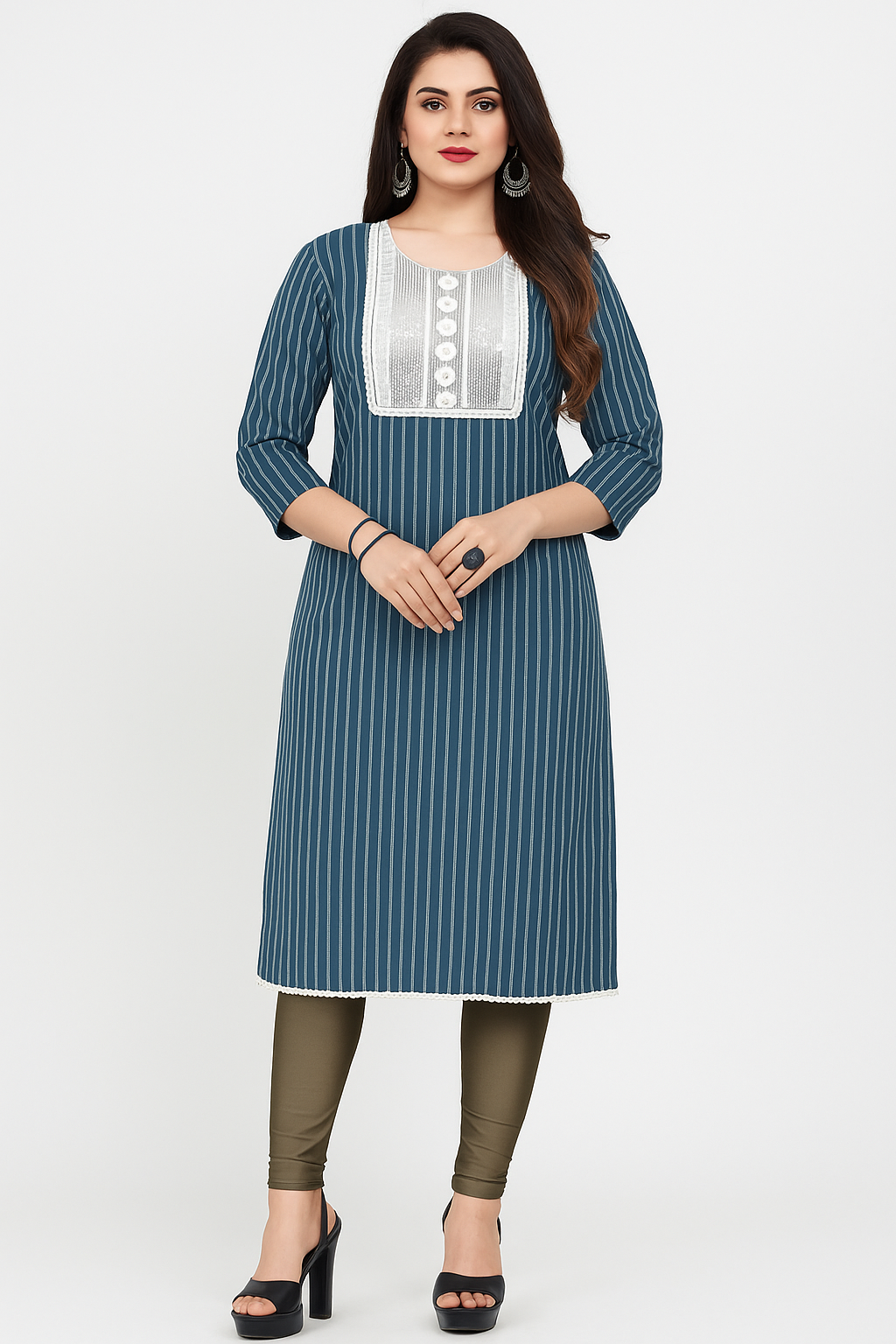 Elegant blue striped cotton kurti featuring a beautiful white embroidered yoke design. The vertical stripe pattern gives a slim and tall look. Perfect for daily wear, office, and semi-formal gatherings. The fabric is soft, skin-friendly, and easy to maintain. Can be paired with leggings, palazzo, or jeans for a modern ethnic look.