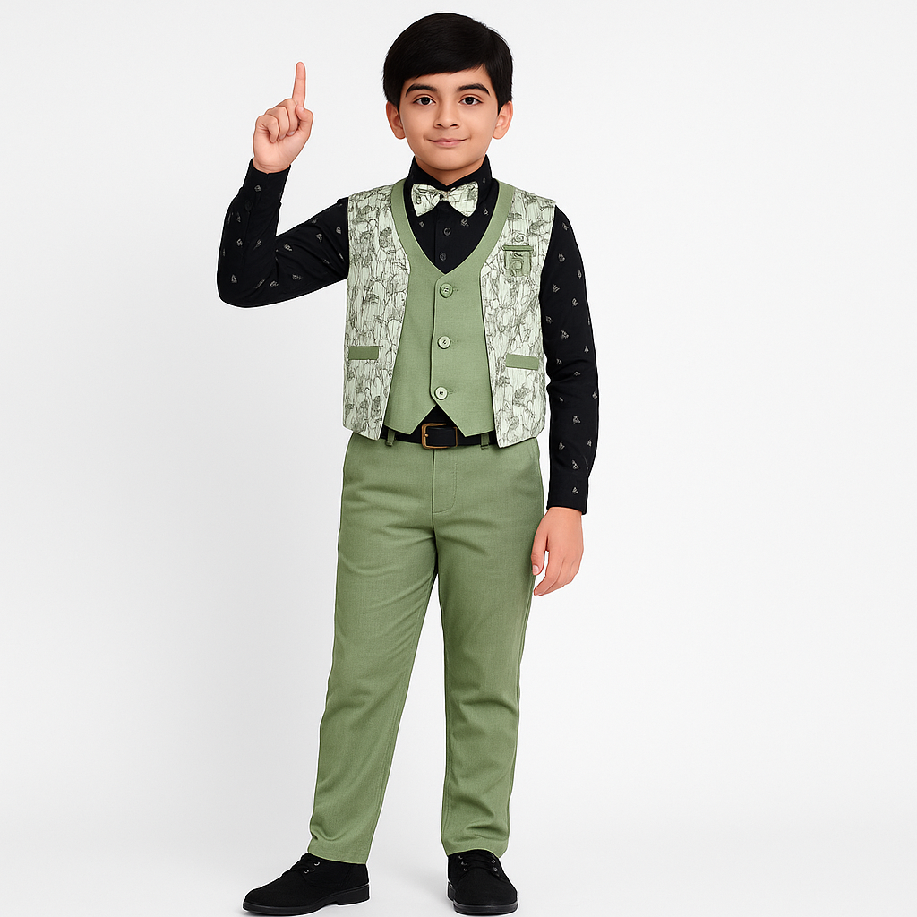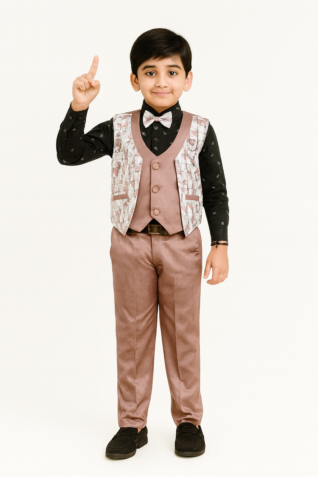 This elegant boys’ 3-piece suit set features a stylish dusty rose satin pant and waistcoat with a printed textured design, paired with a classic black printed shirt. The outfit is completed with a matching bow tie for a sharp, sophisticated look. The regular fit ensures comfort while maintaining a polished style, making it perfect for weddings, festive events, and special occasions. The premium polyester blend fabric gives a smooth finish and is easy to maintain, ensuring your little one looks charming and confident all day.