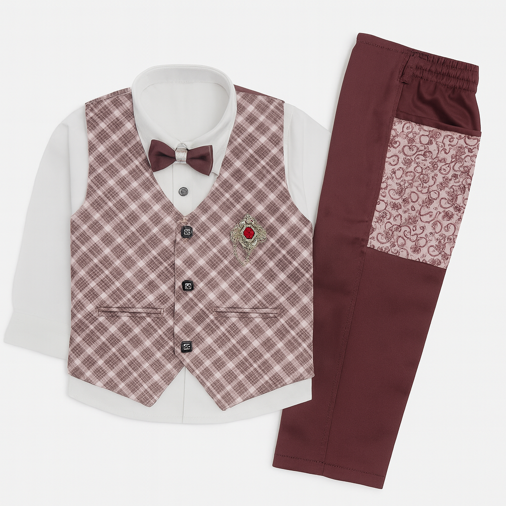 This elegant boys’ 3-piece party wear suit set includes a white cotton shirt, a stylish blue check waistcoat, and navy blue trousers. The waistcoat features a modern checkered design with decorative buttons, a brooch, and a patterned blue handkerchief-style detail. The attached navy blue bow tie adds charm and sophistication to the outfit. The trousers have an elastic waistband for a comfortable fit, making it easy to wear for kids.