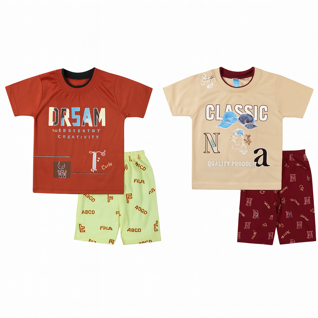 Description: Trendy cotton nightwear set for boys. Includes a Light Green printed T-shirt with “Forever” design, matched with printed Maroon shorts. Soft, breathable, and ideal for nightwear or everyday indoor wear.