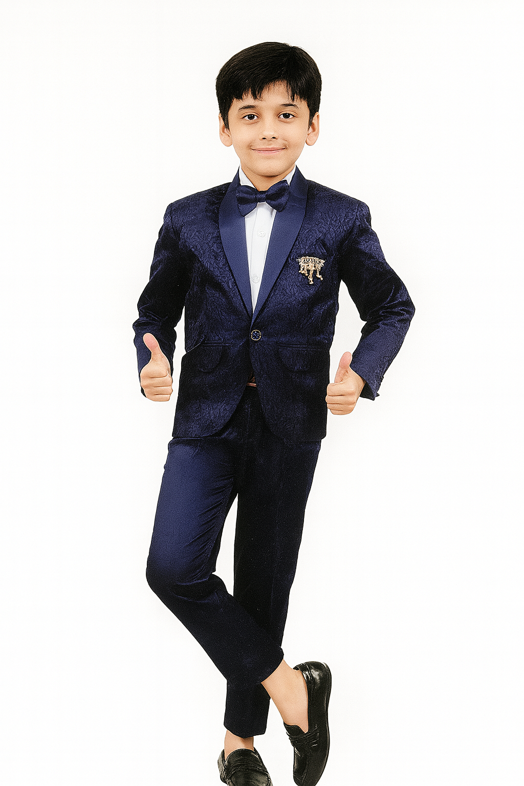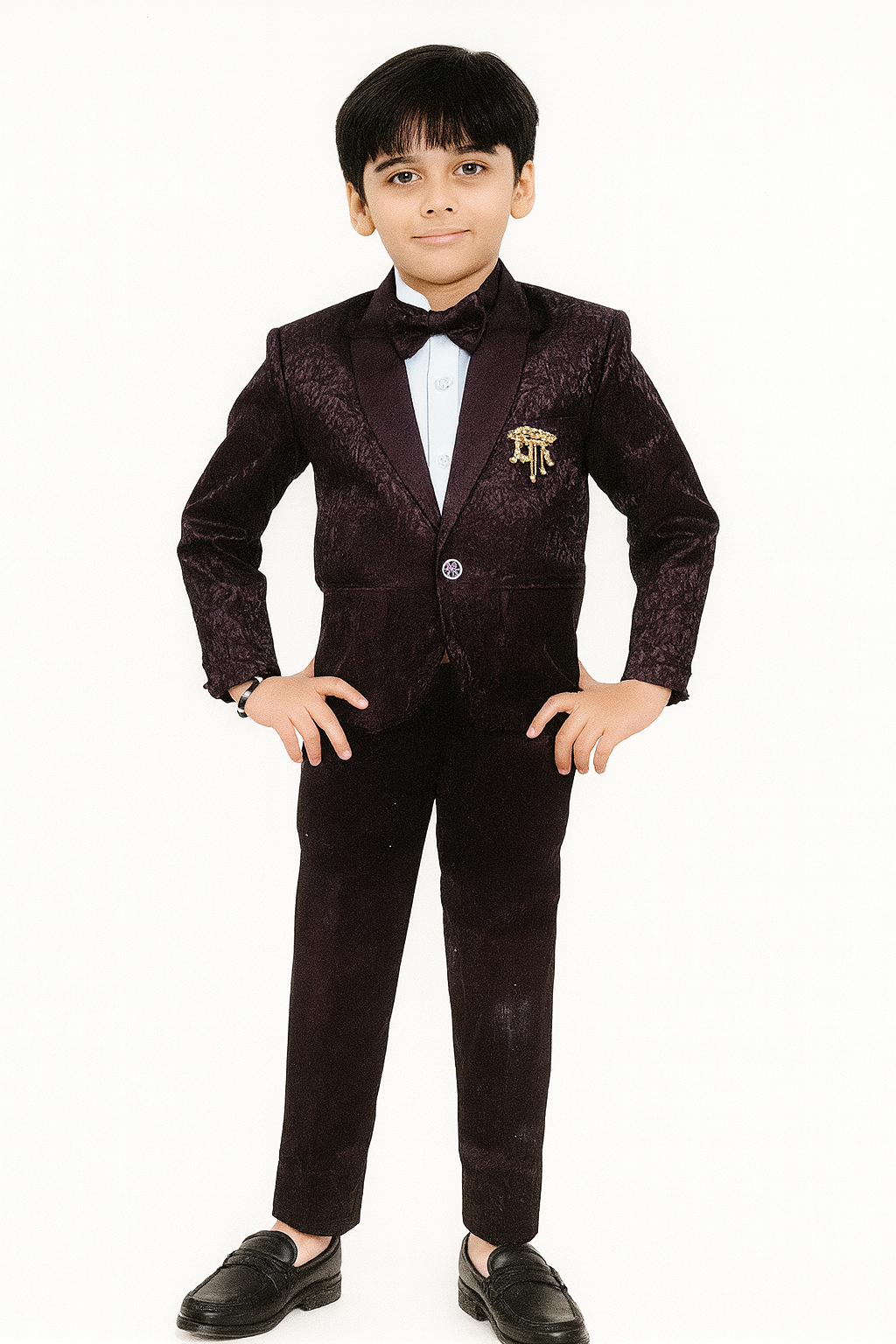 This stylish boys' designer suit set features a dark maroon (wine) blazer with a rich textured pattern, paired with matching trousers. The blazer includes a decorative golden brooch and a single-button closure for a sharp, formal look. A white shirt and matching bow tie complete the ensemble, making it perfect for weddings, festive occasions, and formal gatherings. The premium blended fabric ensures comfort and durability, while the regular fit provides ease of movement for kids. The set is designed to give a classy and confident appearance for any special occasion.