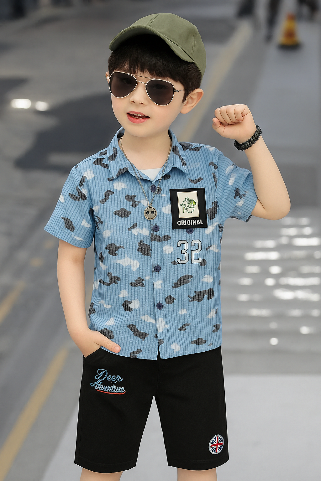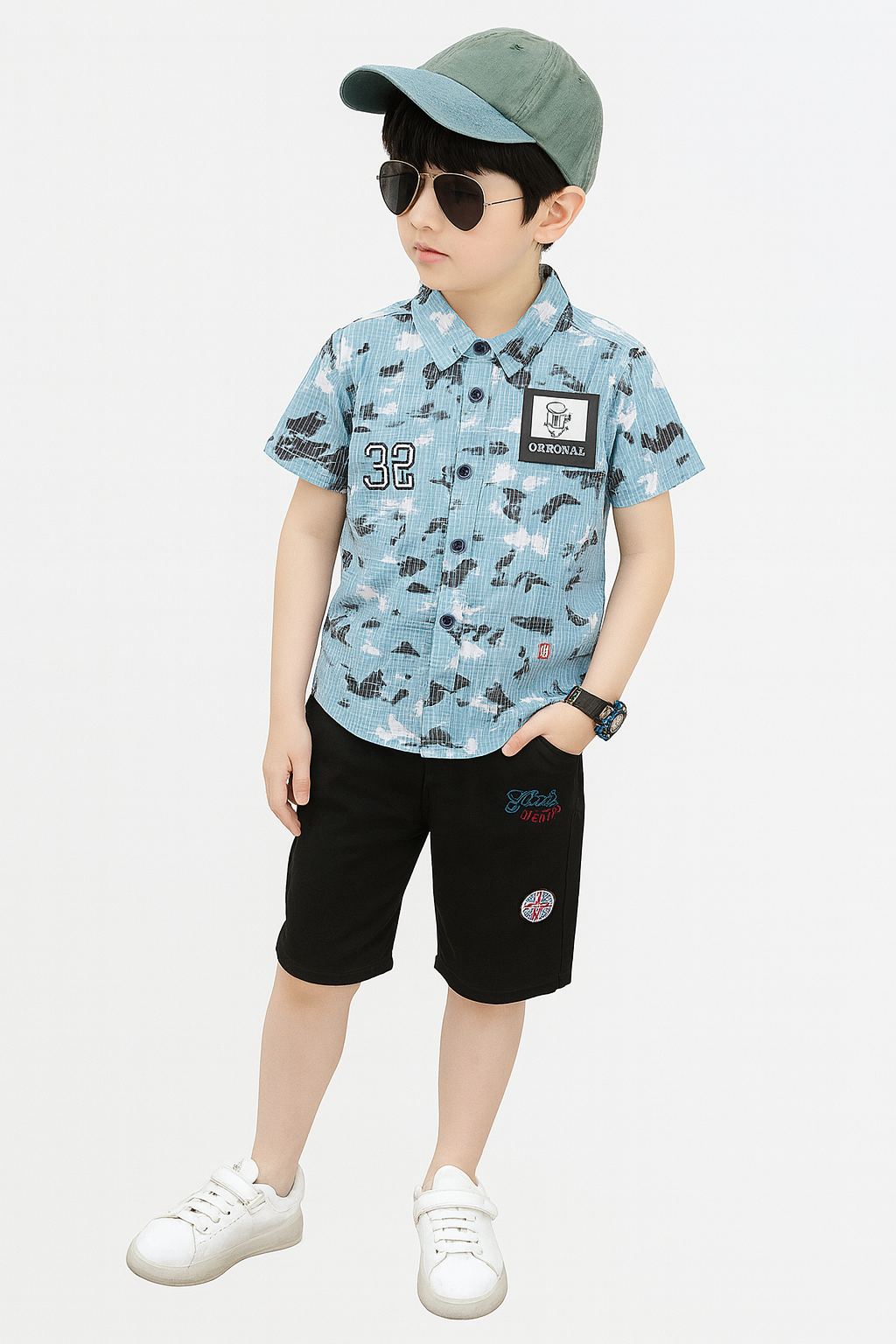 Trendy kidswear set featuring a sky-blue printed shirt with half sleeves and stylish embroidery shorts. Designed in soft cotton blend fabric for comfort and durability. Ideal for casual outings, parties, or everyday wear, giving kids a stylish and cool look.