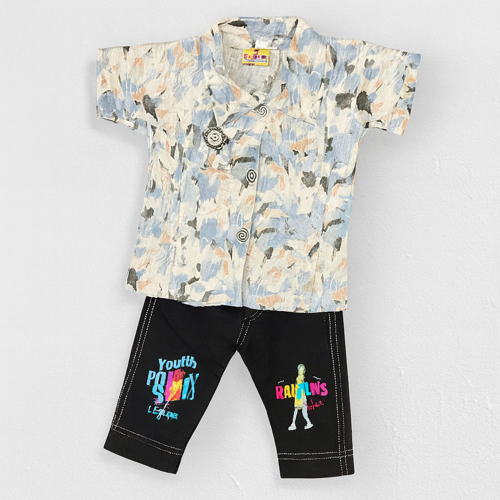 This stylish boys’ 2-piece set includes a printed half-sleeve shirt with button closure and a trendy black pant with colorful printed graphics. Designed for comfort and style, this outfit is perfect for everyday wear, playtime, or casual outings. The breathable cotton-blend fabric ensures all-day comfort, while the smart design keeps your little one looking fashionable.