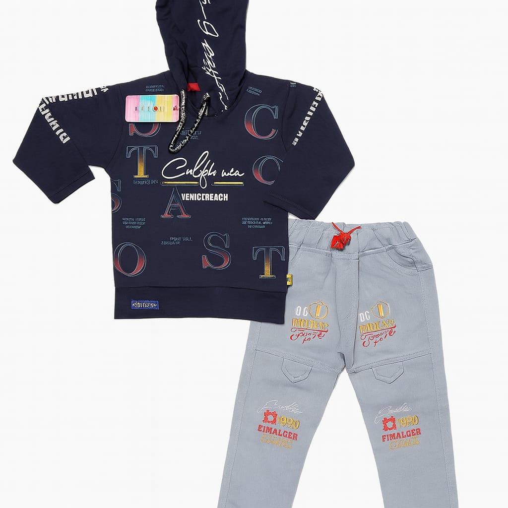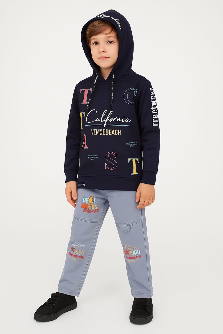 Trendy California-themed kids’ outfit featuring a navy blue printed hoodie with “Venice Beach” text and a light grey pant with cool embroidered patches. The set offers a stylish streetwear look with comfort for daily wear, playtime, or outings. Perfect for keeping kids warm and fashionable during cooler days.