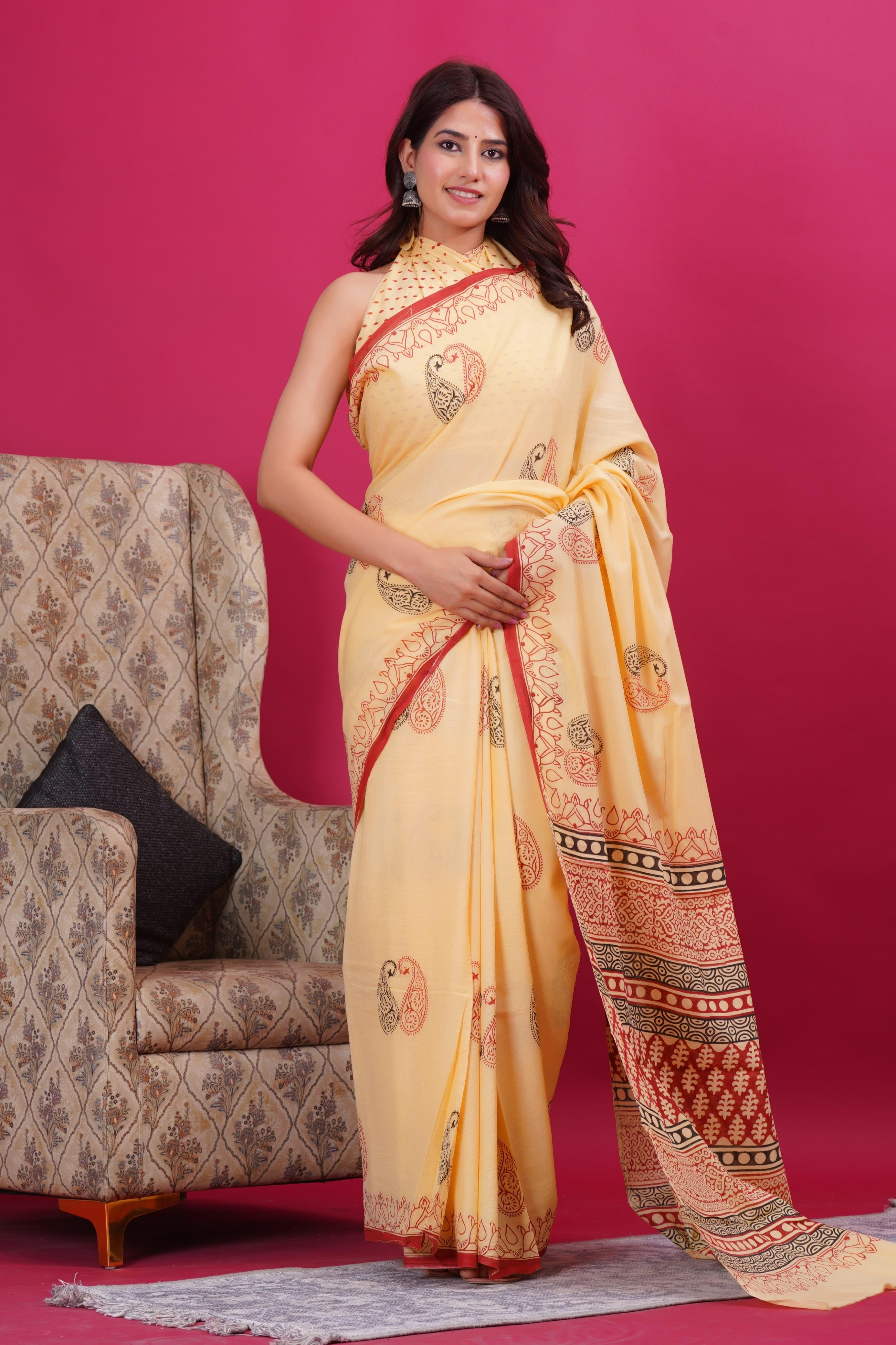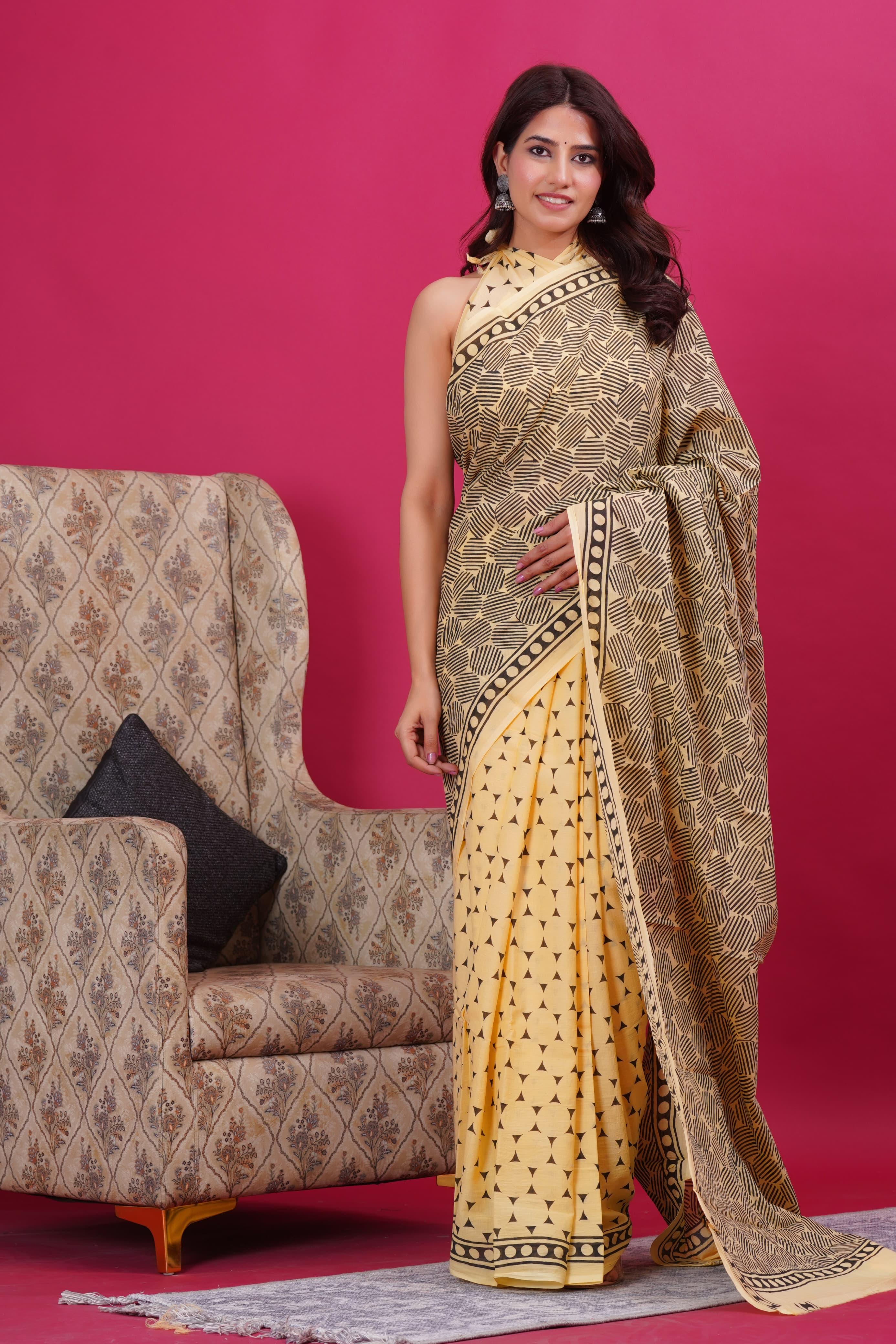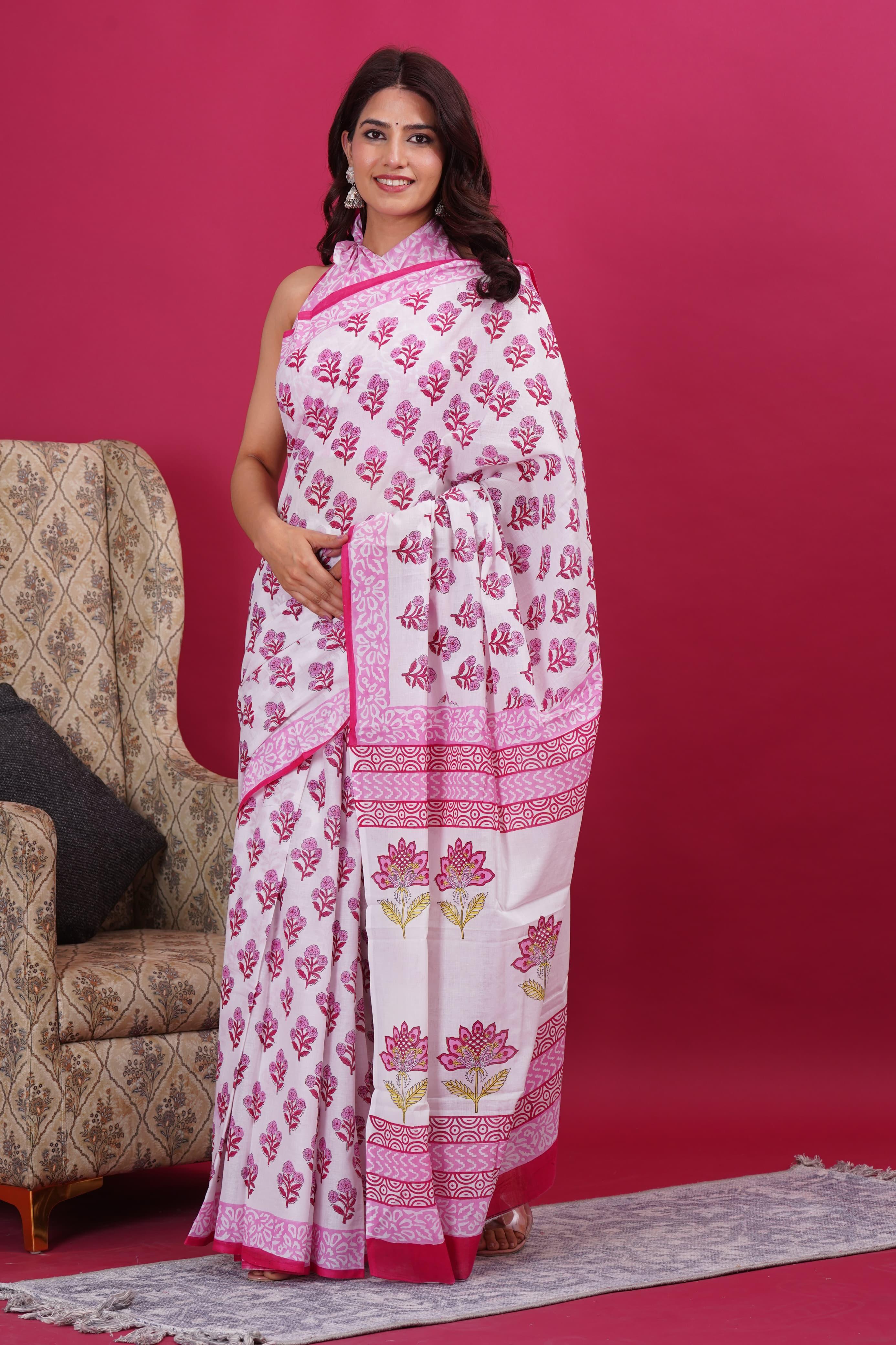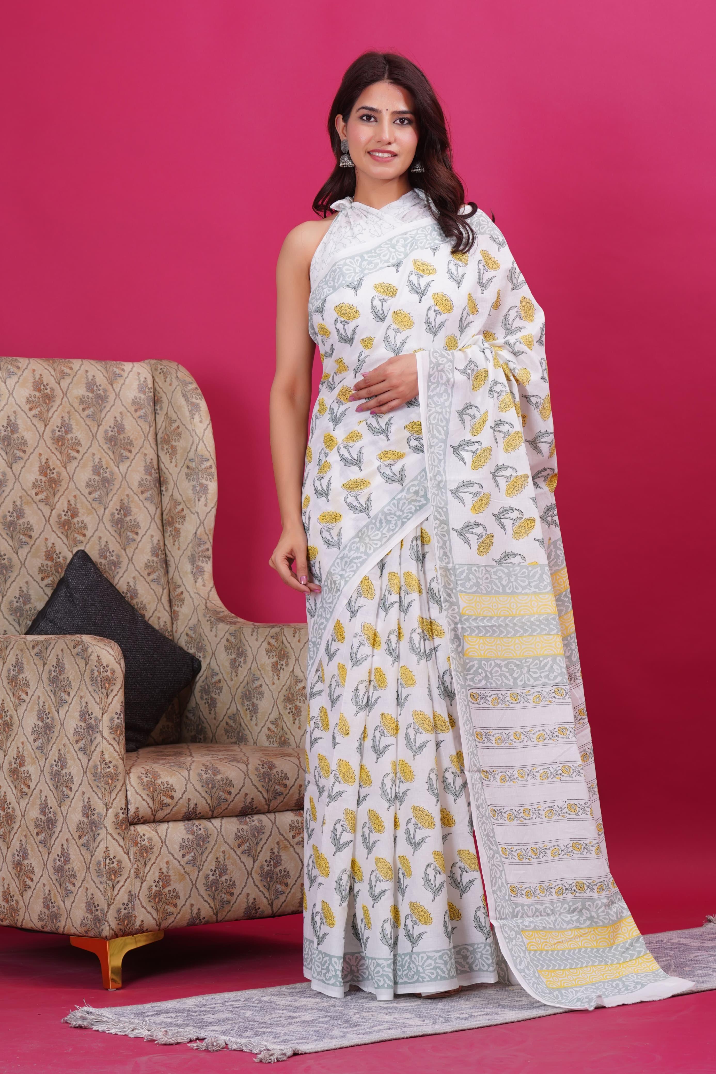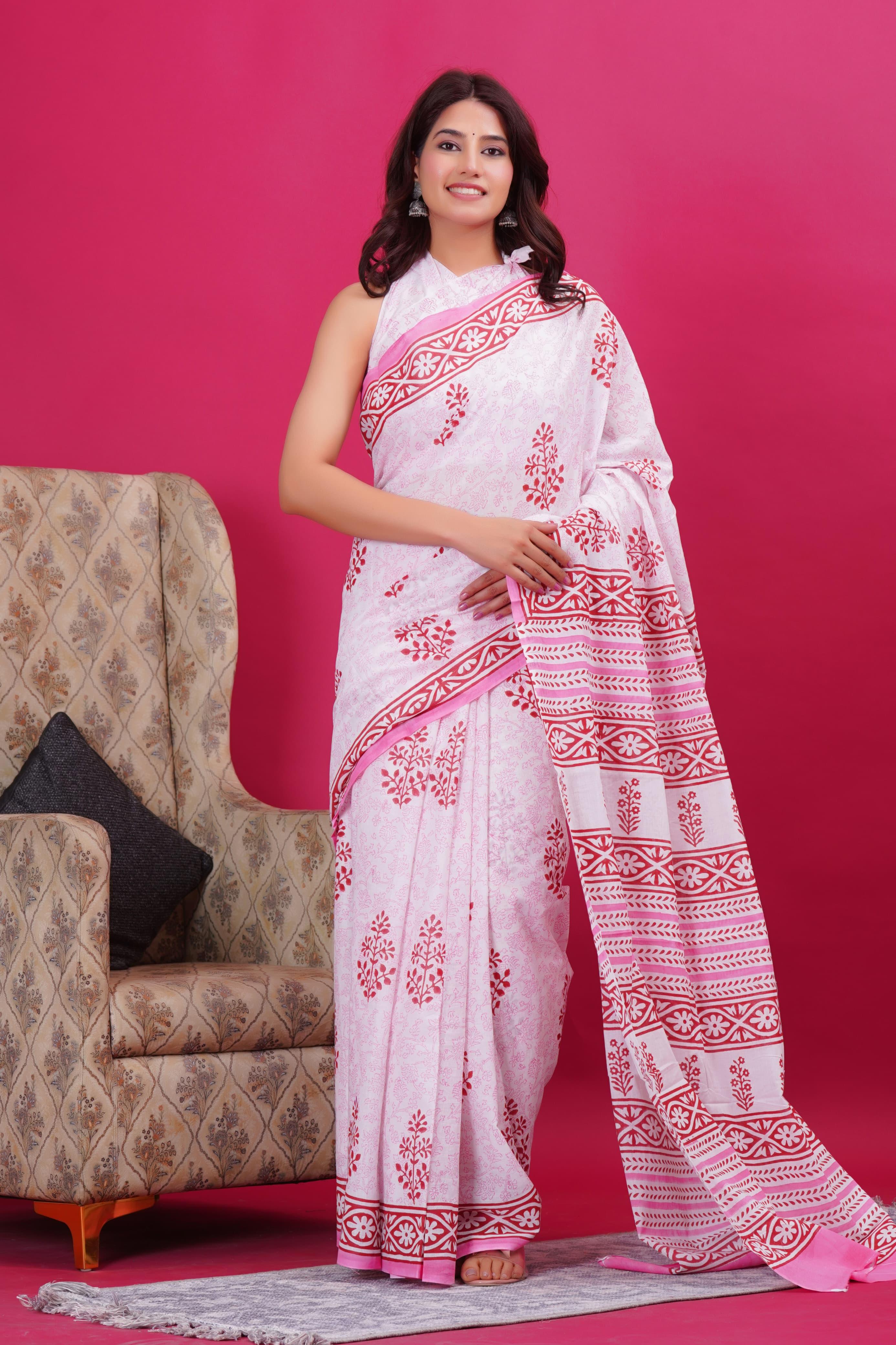 A cotton hand block printed saree is a traditional Indian saree made using a centuries-old printing technique where artisans stamp intricate designs onto fabric using hand-carved wooden blocks.Product Title: