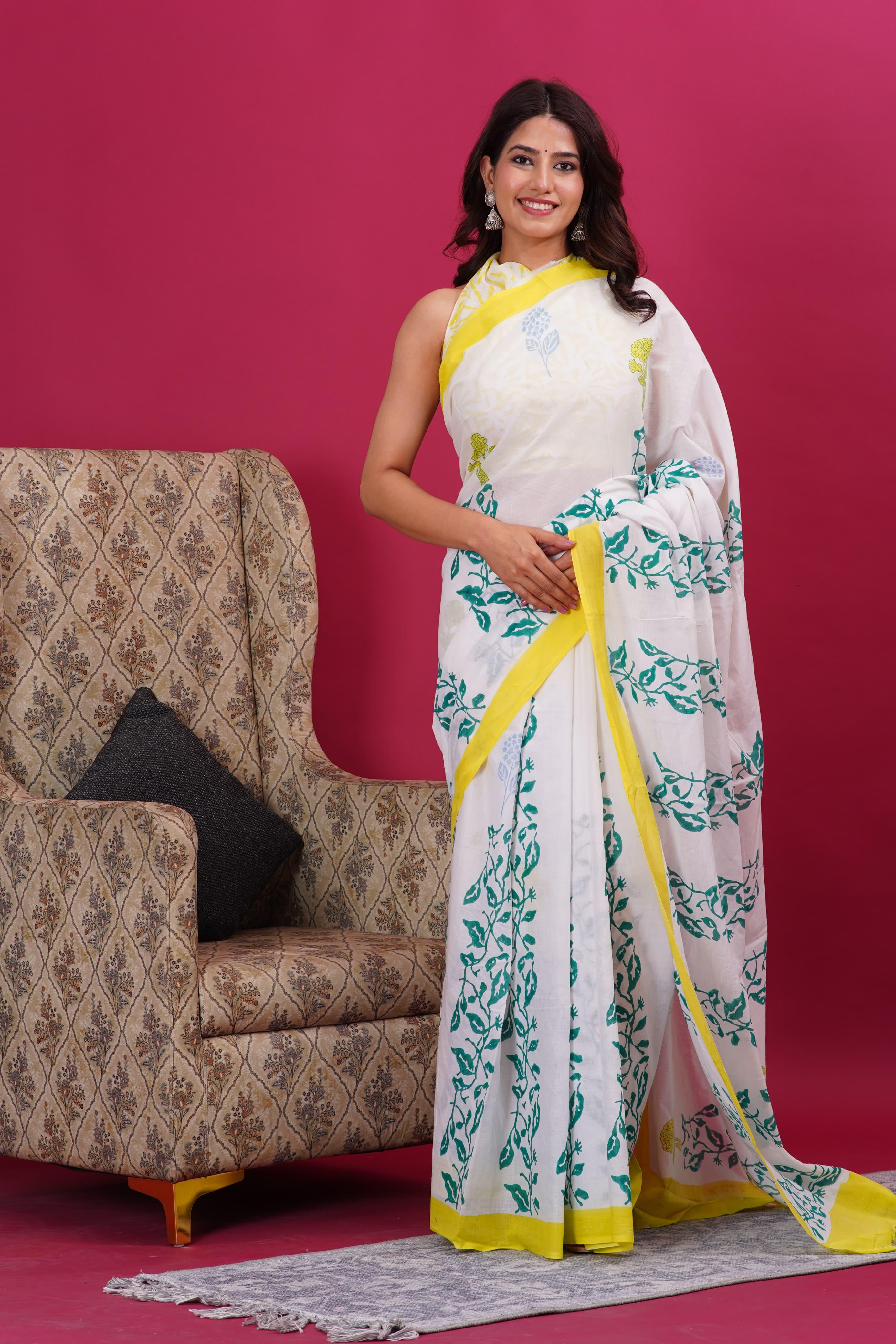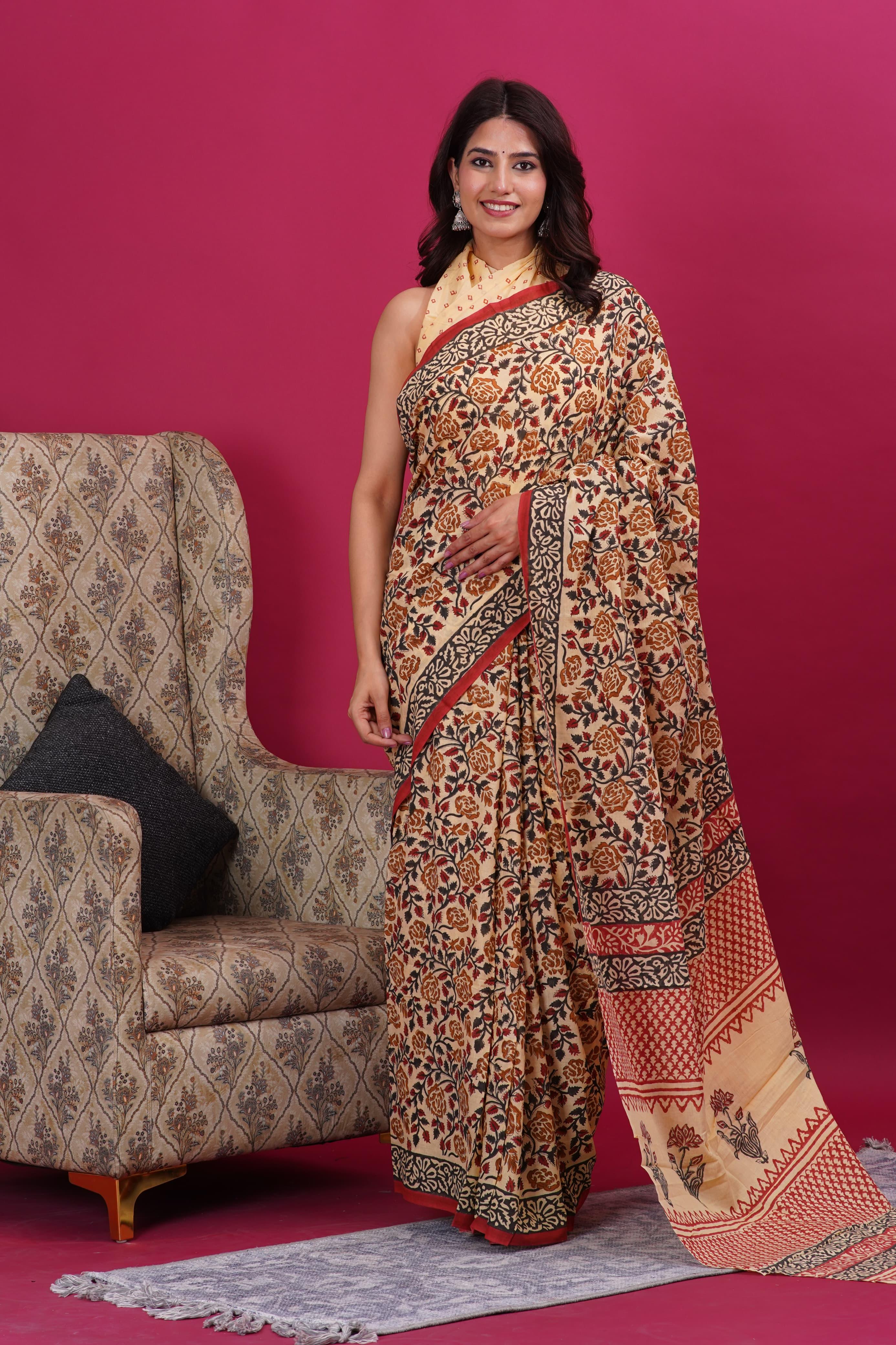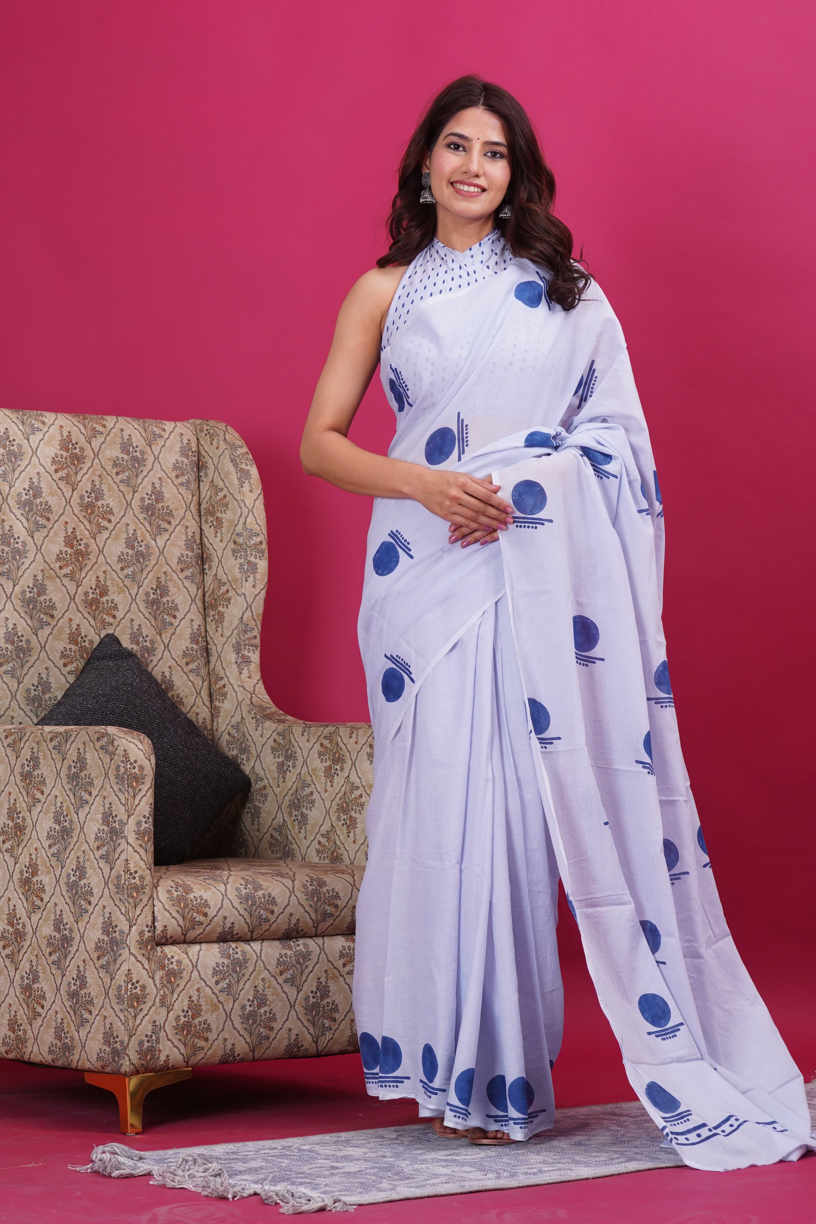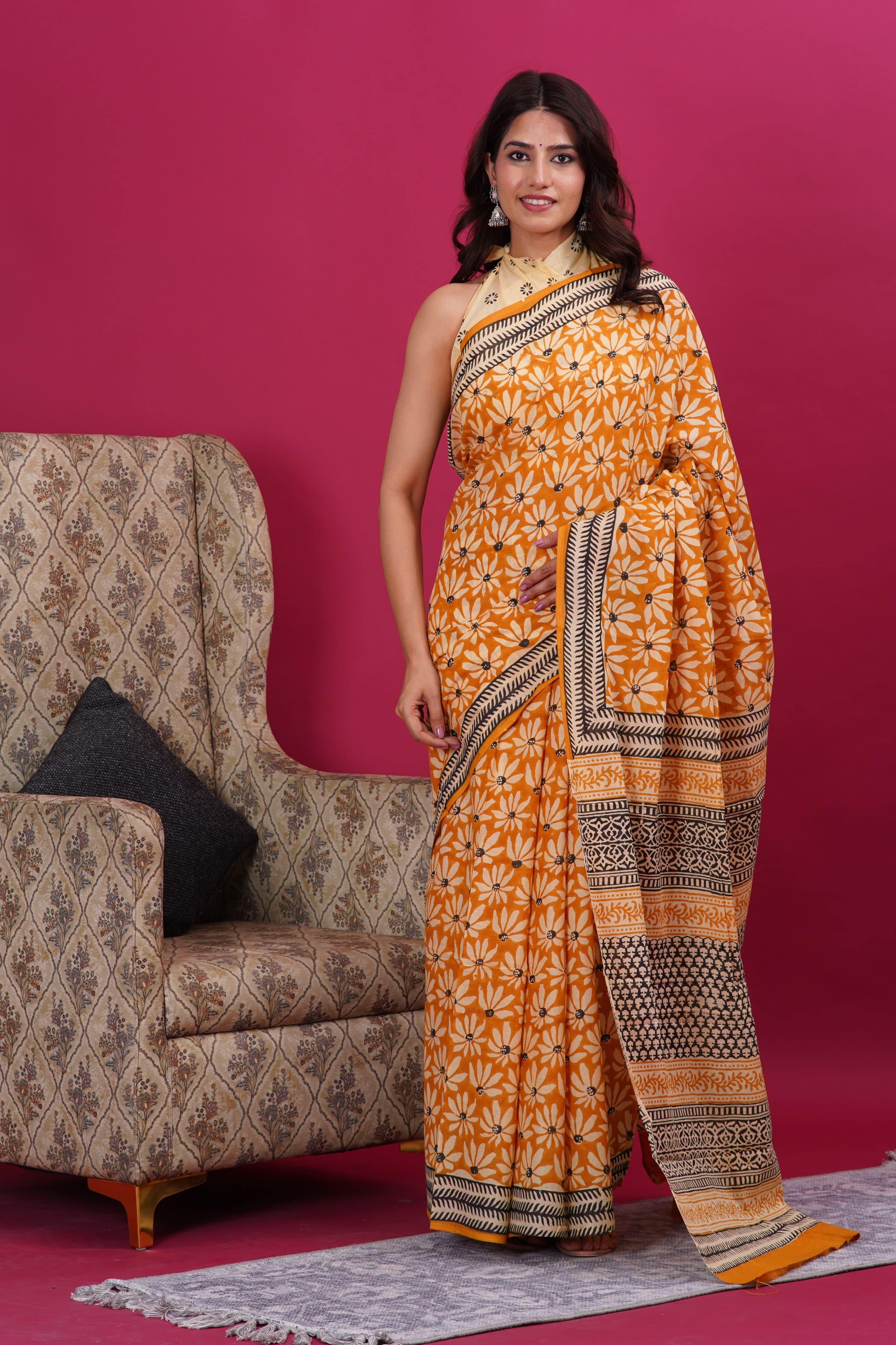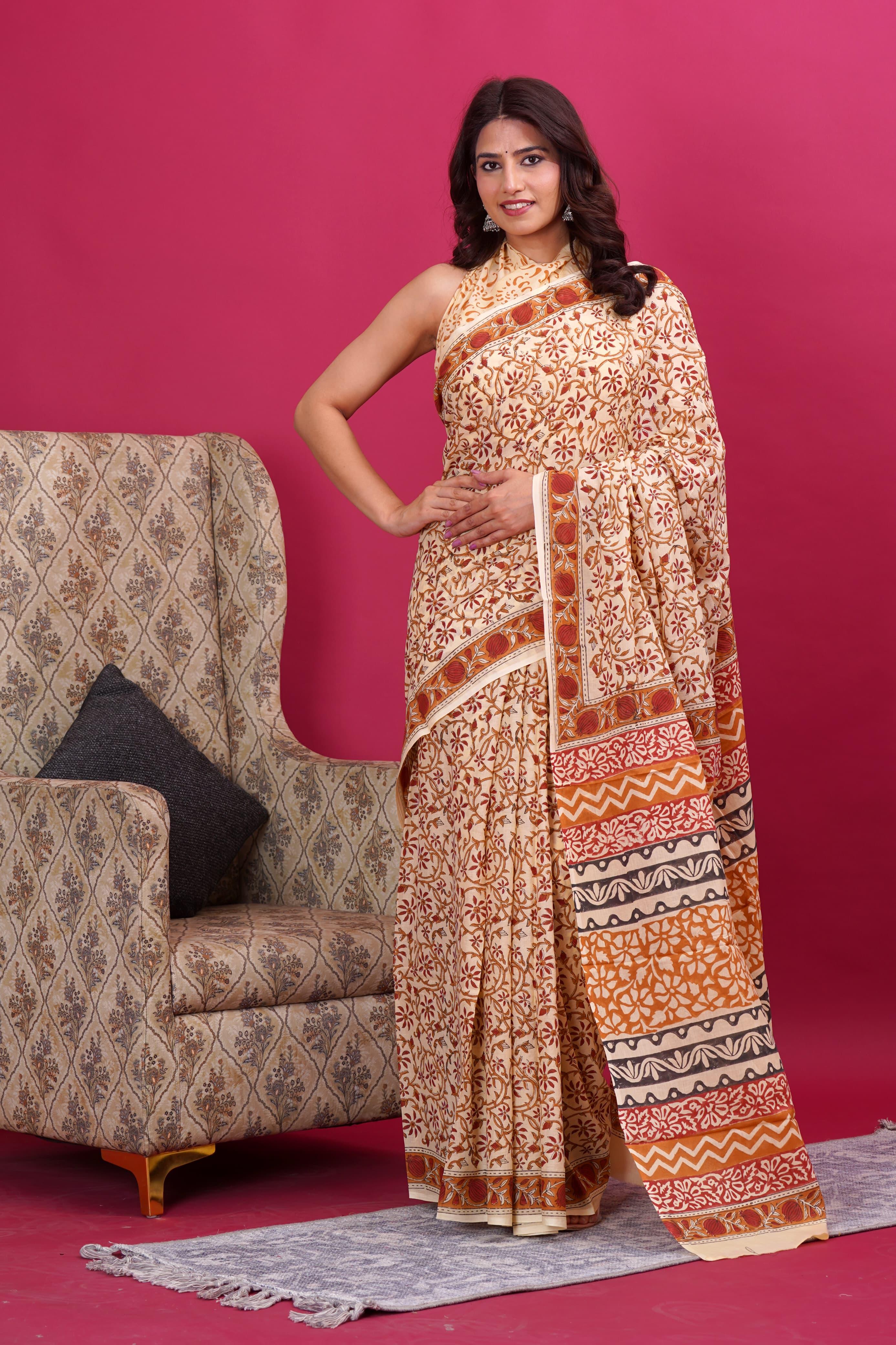 A cotton hand block printed saree is a traditional Indian saree made using a centuries-old printing technique where artisans stamp intricate designs onto fabric using hand-carved wooden blocks.Product Title: