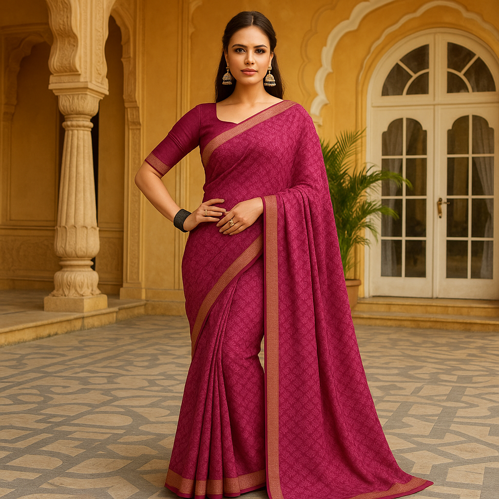 This gorgeous rani-pink woven saree comes with an elegant golden zari border and soft drape feel, perfect for festive and wedding occasions. The lightweight silky fabric makes it comfortable for long hours, while the intricate weave pattern adds a premium traditional touch. Pair it with statement jewellery for a royal ethnic look.