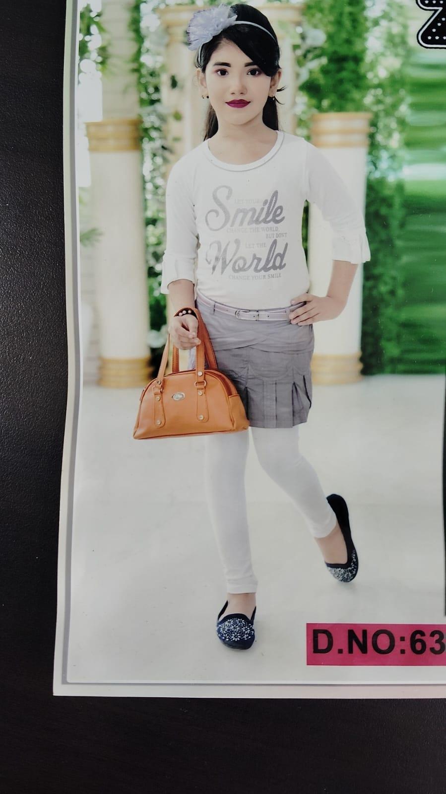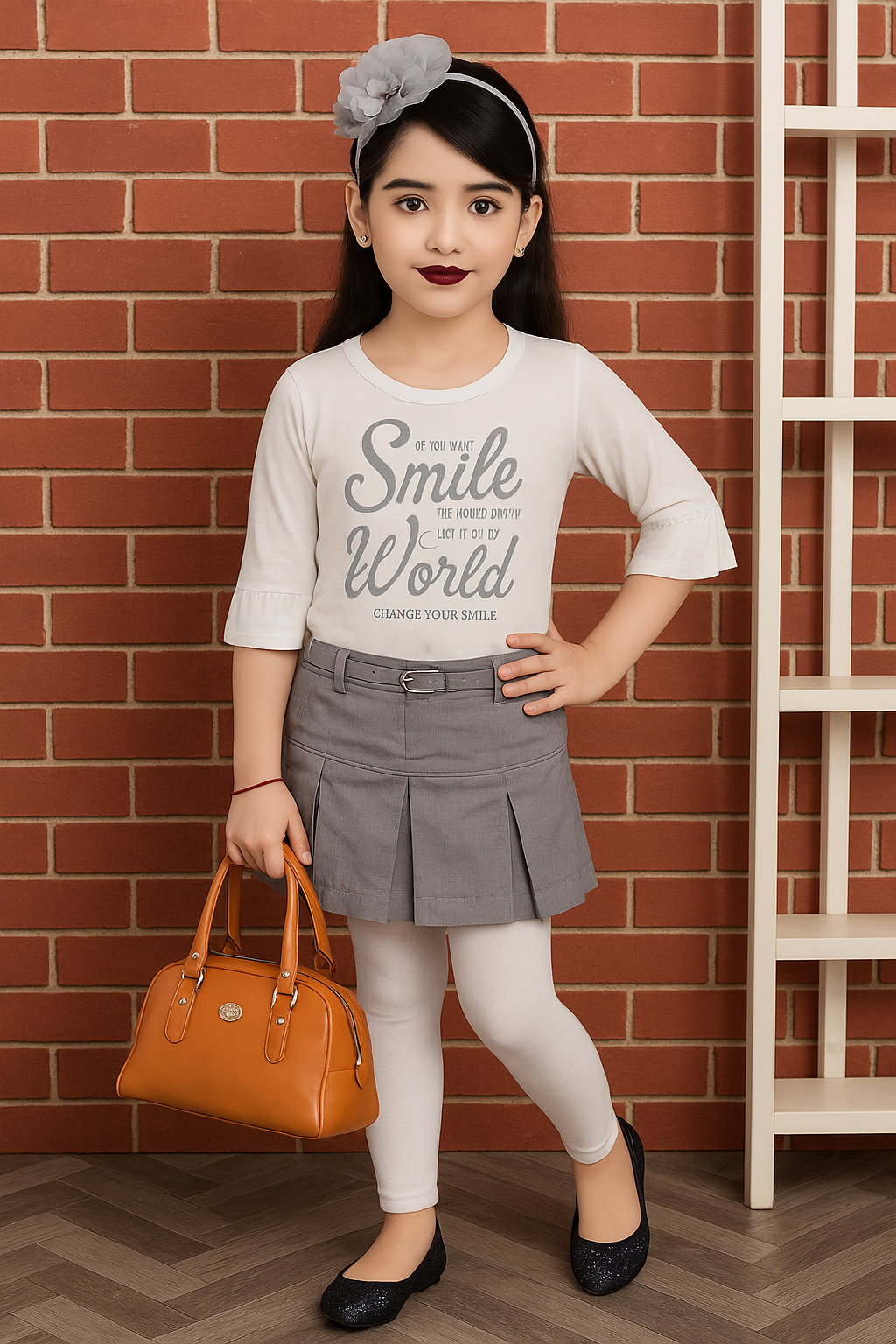 Description: Stylish 3-piece outfit for girls featuring a white printed round-neck top with half sleeves, a grey pleated skirt with matching belt, and comfortable white leggings. Comes with a matching grey headband and a tan handbag for a chic look. Perfect for casual outings, parties, or school events, offering both comfort and elegance.