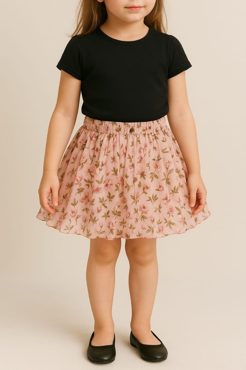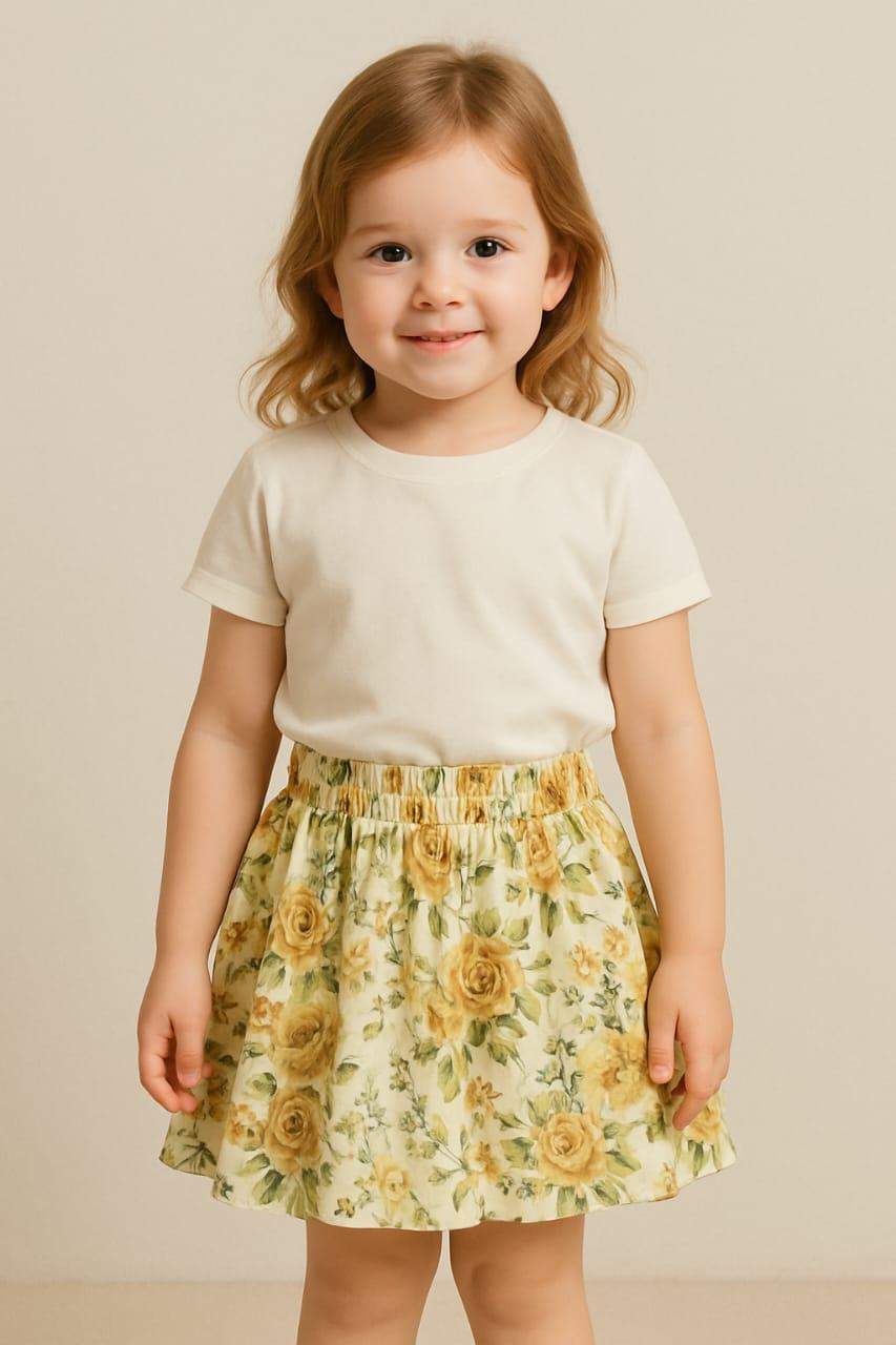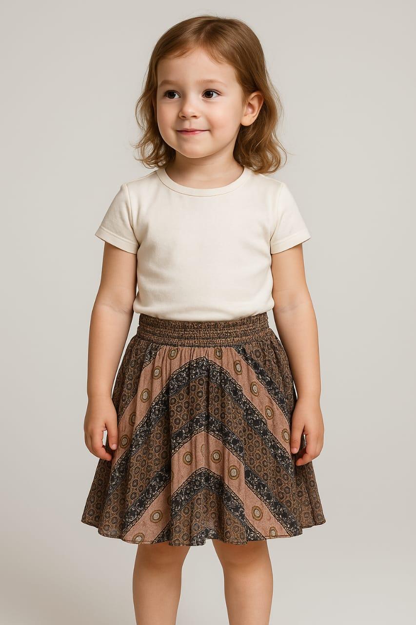 A stylish and comfortable outfit set for little girls. The plain cream cotton t-shirt pairs perfectly with a flowy printed skirt featuring brown and black geometric patterns. The skirt has an elastic waistband for a snug yet comfortable fit, making it ideal for daily wear, outings, and casual occasions.