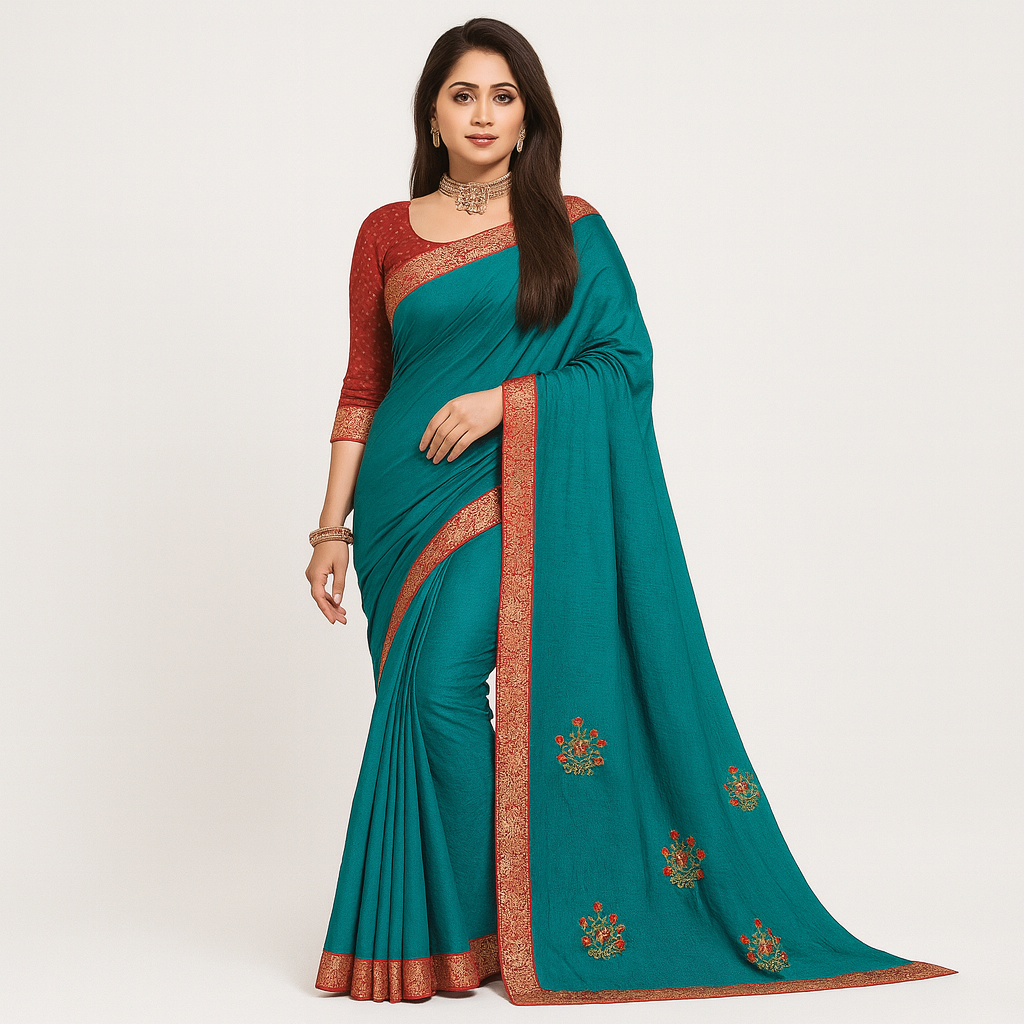 A premium silk-blend saree in a rich orange shade, beautifully bordered with maroon and golden zari embroidery. The matching maroon blouse adds elegance and grace, making it perfect for festive or wedding occasions. Soft, lightweight, and easy to drape, this saree combines tradition with contemporary style.