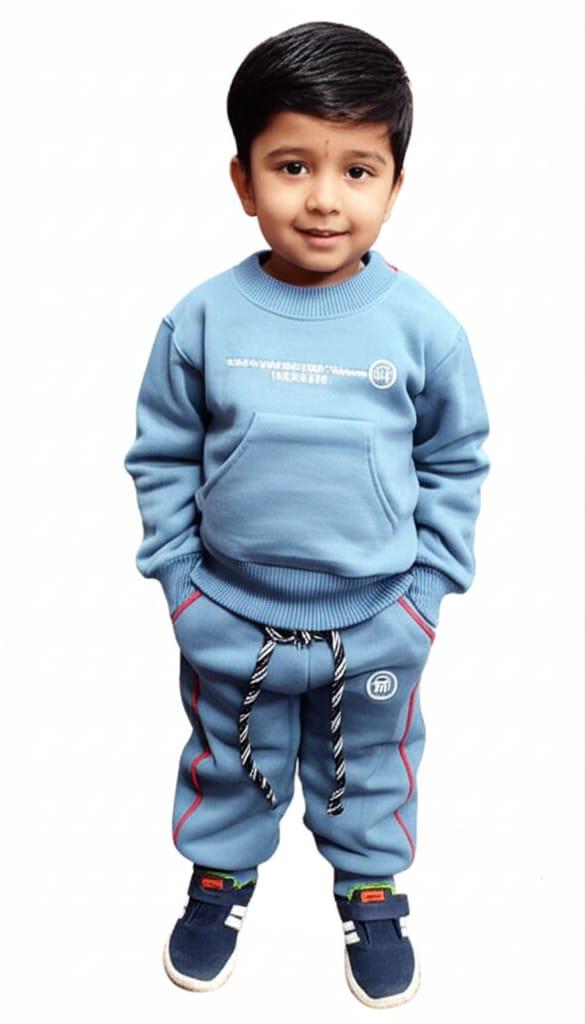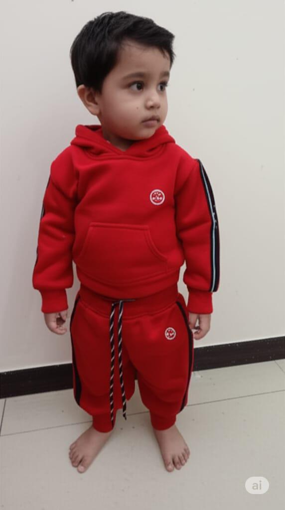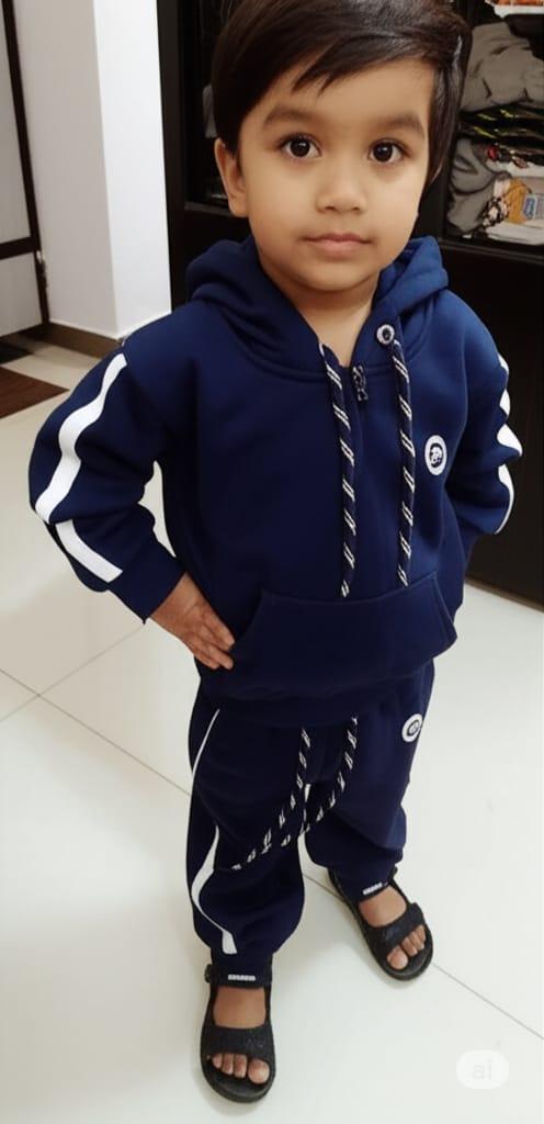 This adorable kids’ tracksuit set includes a navy blue hoodie and matching jogger pants with white side stripes. The outfit features a front kangaroo pocket, adjustable drawstrings, and a soft inner lining to
