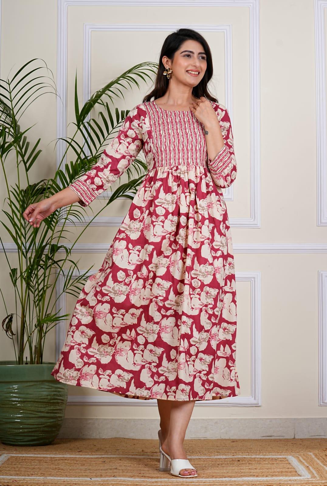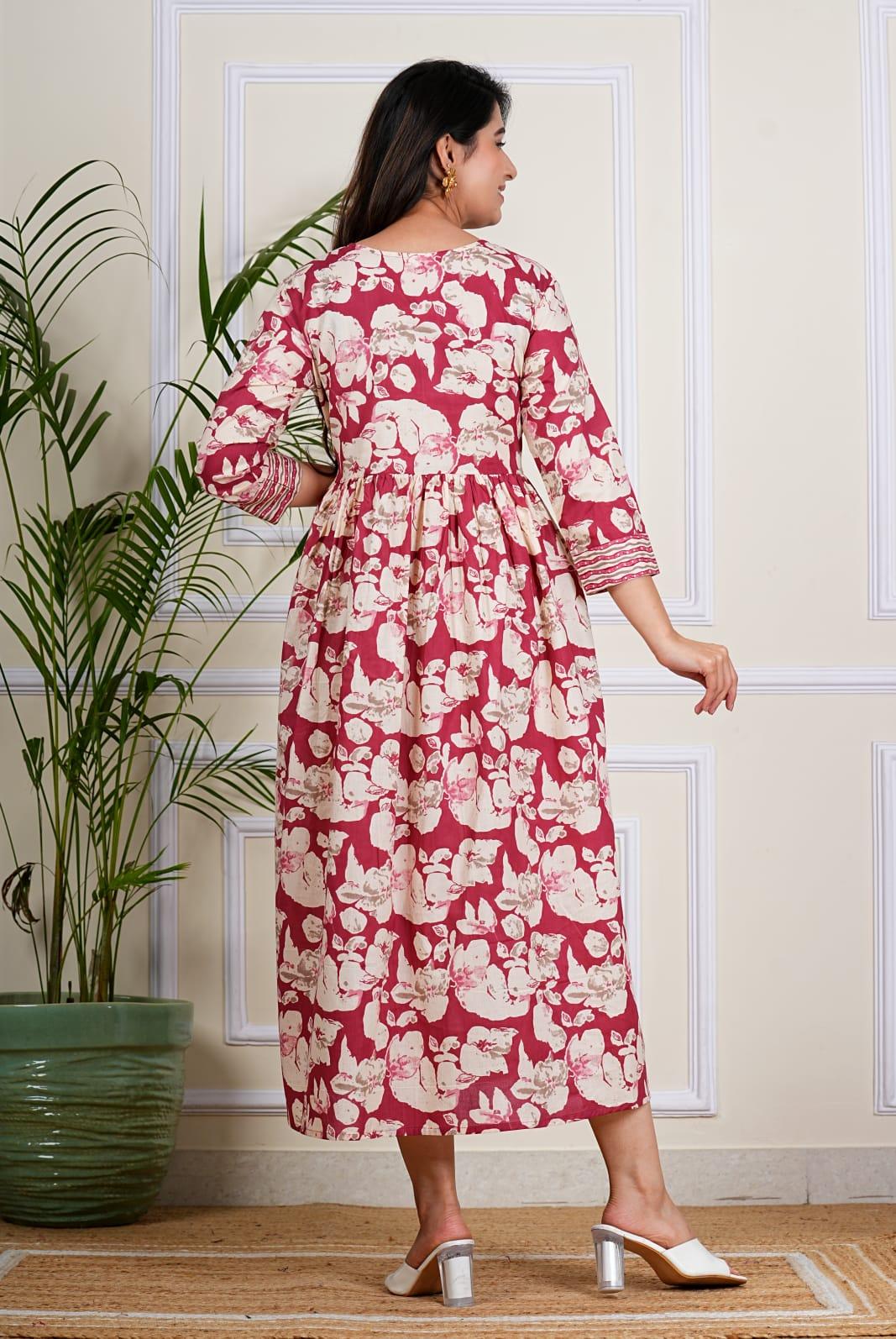 cotton fabric. Featuring a rich maroon base with cream floral prints all over, this kurti blends traditional charm with modern comfort. The front yoke is adorned with vertical stripe detailing that adds a structured look, while the gathered flare below the bust ensures a graceful silhouette. Designed with 3/4th sleeves and a round neckline, it offers a relaxed yet stylish fit perfect for daily wear, casual outings, or festive gatherings. Pair it with minimal accessories and block heels for a complete ethnic look.
