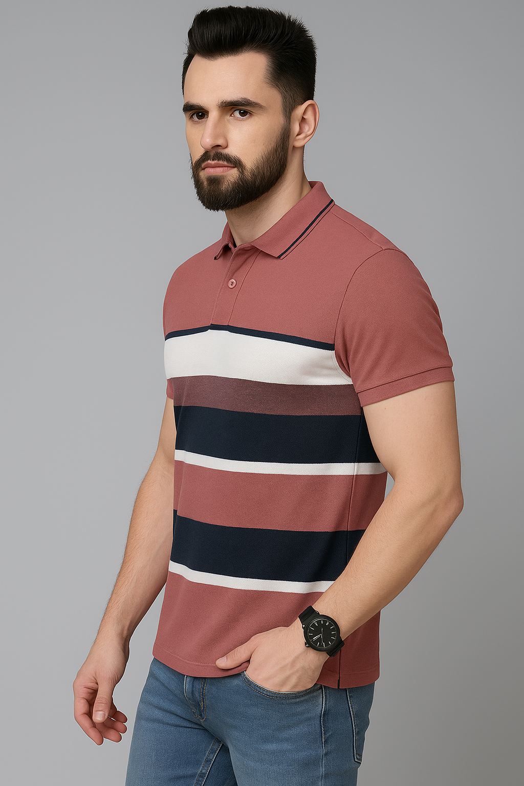 This men’s polo T-shirt features a stylish striped design with a brick red base and navy blue & white stripes. Crafted from premium cotton fabric, it ensures comfort and breathability throughout the day. The regular fit and short sleeves make it perfect for casual outings, college wear, or weekend gatherings. Pair it with jeans or chinos for a smart, effortless look.