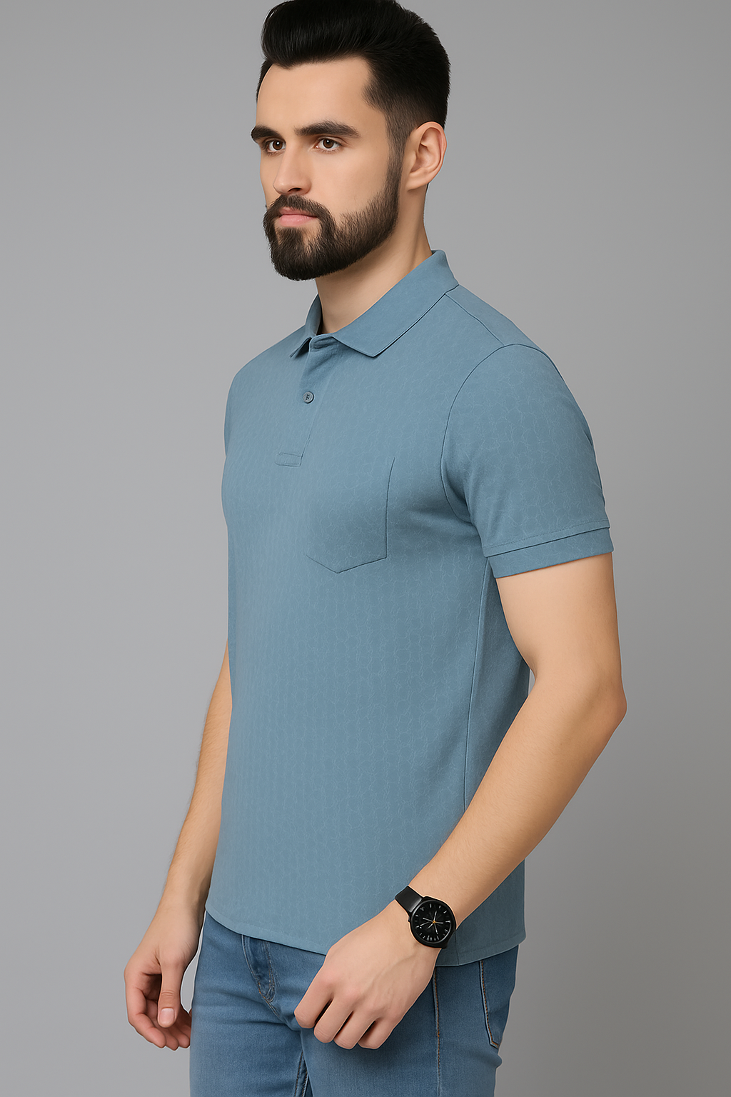 This Men’s Sky Blue Polo T-Shirt is designed with a subtle hexagon texture pattern and a classic pocket on the chest, giving it a modern yet elegant look. Crafted from a soft cotton blend, it ensures all-day comfort and breathability. The short sleeves and regular fit make it a perfect choice for casual outings, office wear, or daily use.