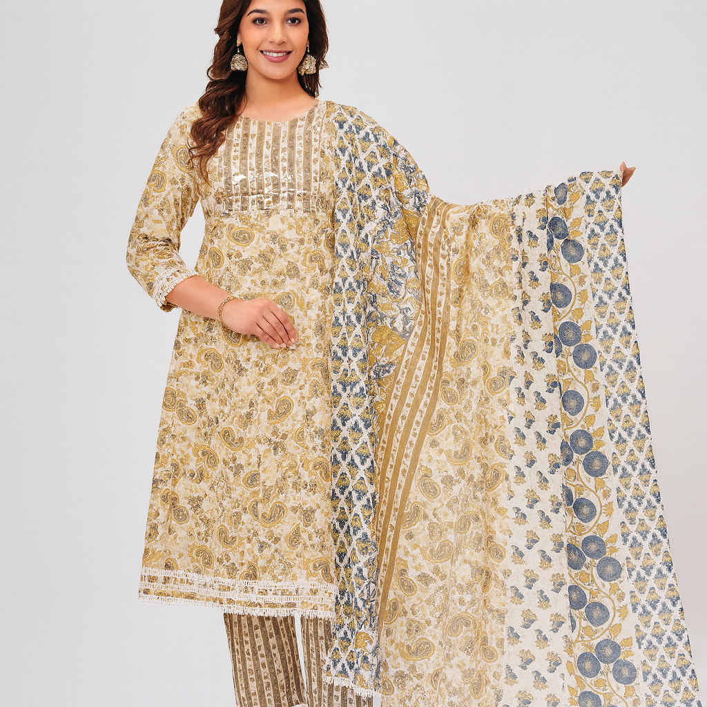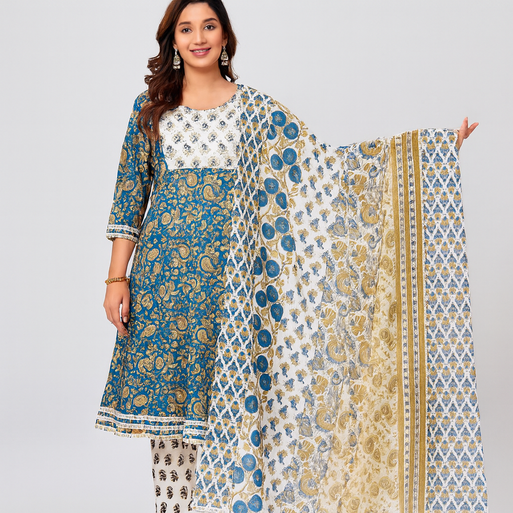 This elegant kurta set features a blue floral printed kurta with a contrasting white yoke, paired with white printed straight pants and a matching dupatta. The breathable cotton fabric ensures all-day comfort, making it ideal for office wear, casual outings, or festive gatherings. The design blends traditional prints with a modern silhouette for a graceful yet stylish look.