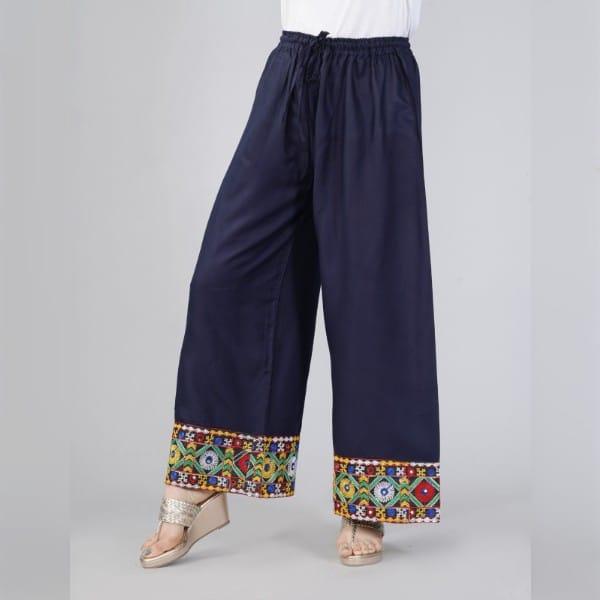Bright yellow rayon palazzo pants featuring a comfortable elastic waistband and drawstring. The highlight is the beautiful multi-color traditional mirror work embroidery at the hem, adding a vibrant ethnic touch. Perfect for pairing with kurtas, tops, or tunics for casual and festive occasions.