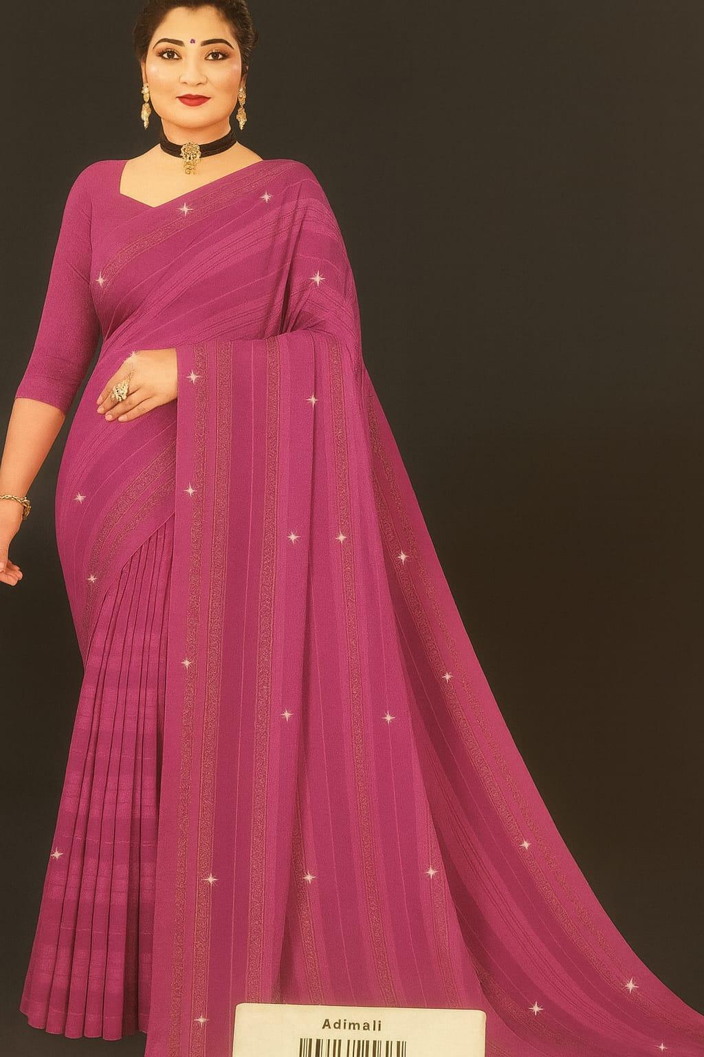 This Adimali Sifoin Saree blends simplicity and elegance. The magenta hue adds charm, while the self-design stripes and subtle sparkle make it ideal for both festive and formal occasions. Made from premium sifoin fabric, it offers comfort and effortless drape. Paired with a matching blouse piece, this saree exudes traditional beauty with a modern touch.