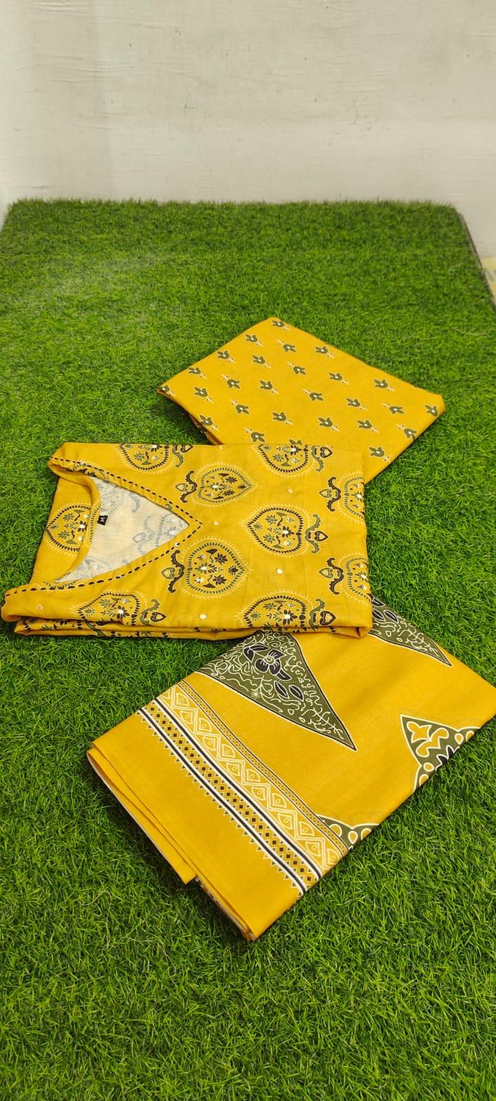 Kameez Fabric (Top): Mustard with all-over traditional prints, front panel already styled with neckline.