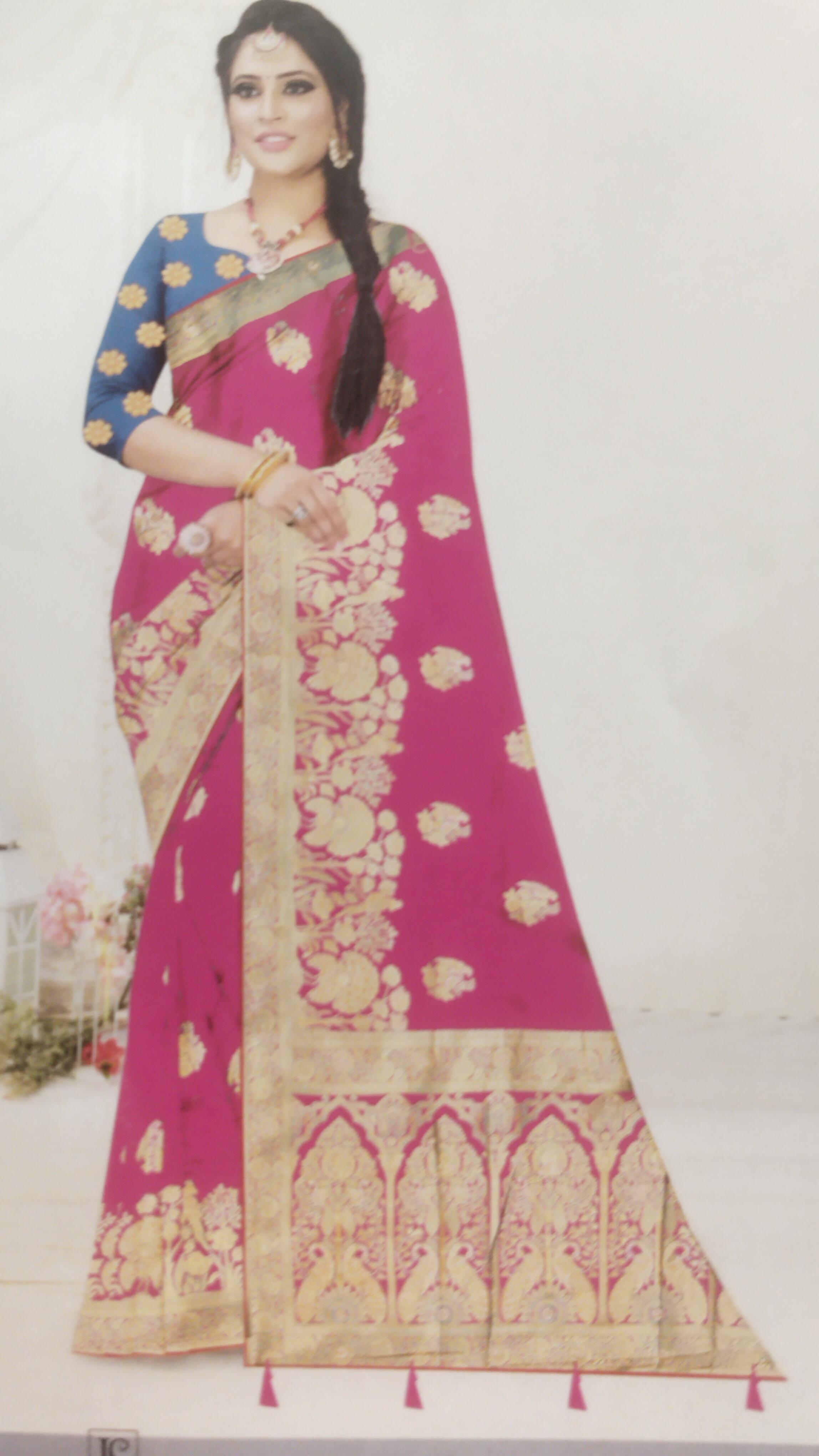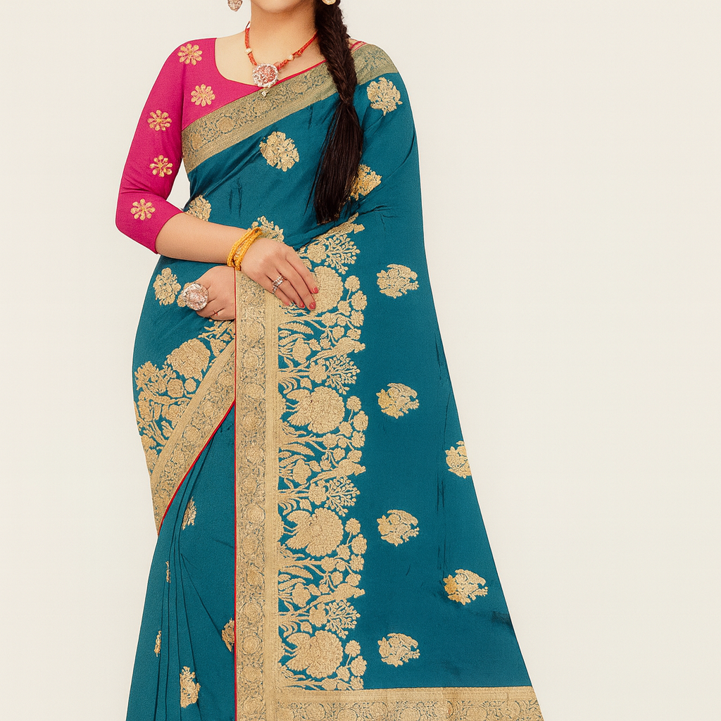 This beautiful mustard yellow Banarasi silk saree features rich golden zari floral motifs and a detailed woven border that adds a royal touch. The contrasting navy blue blouse with intricate golden embroidery enhances the overall elegance. Perfect for weddings, festive occasions, and traditional celebrations, this