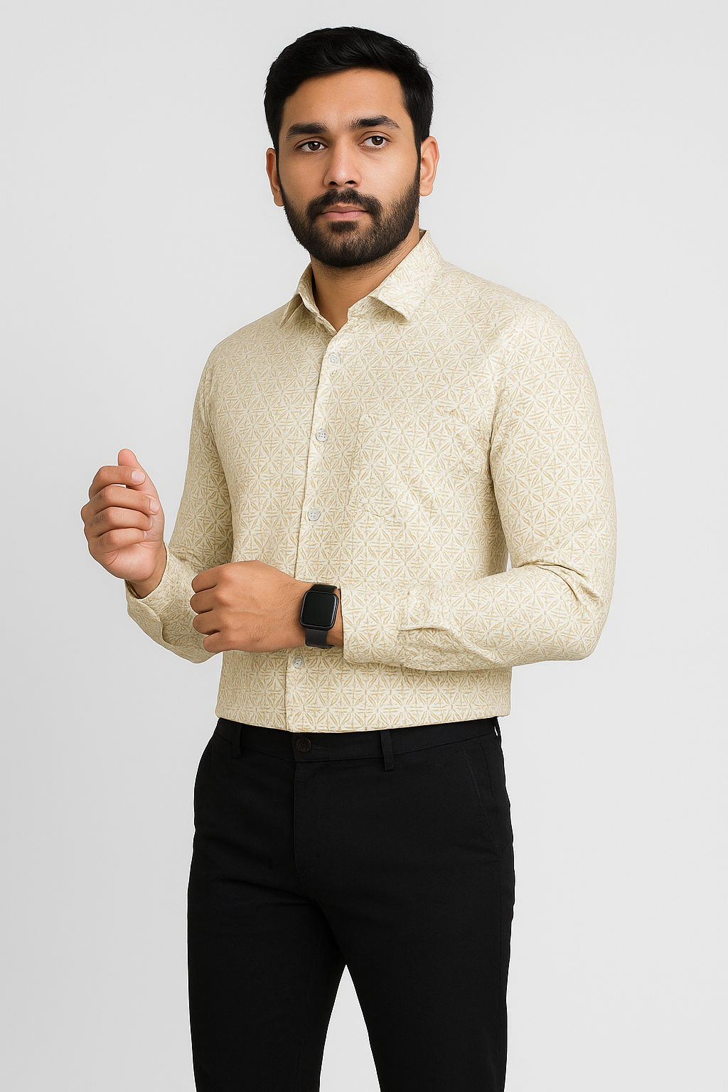 Upgrade your wardrobe with this stylish printed shirt from Unoer. Designed in a premium cream color with golden geometric prints, it gives a perfect blend of comfort and elegance. Made from 100% pure cotton, this shirt ensures softness, breathability, and durability. Ideal for casual outings, office meetings, or party occasions, this full-sleeve shirt adds a modern and confident look to your style.