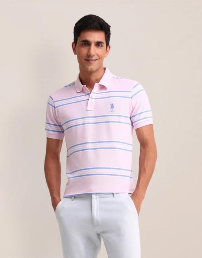 This U.S. Polo Assn. men's polo t-shirt features a classic light pink base with clean blue and white horizontal stripes, adding a fresh and timeless look to your wardrobe. Made from a soft cotton blend fabric, it ensures breathable comfort throughout the day. The polo collar and short sleeves offer a structured yet relaxed silhouette, while the embroidered brand logo on the chest enhances its premium appeal. Perfect for casual outings, weekend getaways, or everyday wear.