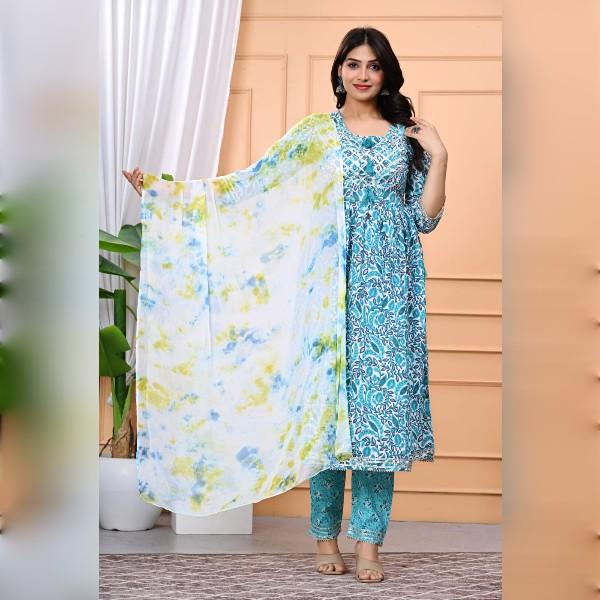 Step into elegance with this charming blue and white floral print kurta set crafted from pure cotton fabric. The calf-length kurta features a round neckline, delicate lace detailing on the front yoke, and 3/4th sleeves for a graceful appearance. Paired with matching printed cotton pants and a multicolored tie-dye cotton dupatta, this ensemble ensures both comfort and style. Perfect for festive gatherings, casual outings, or workdays — this outfit brings a refreshing vibe to your ethnic collection.