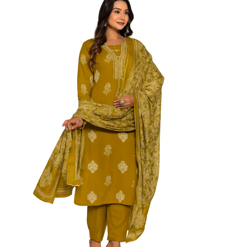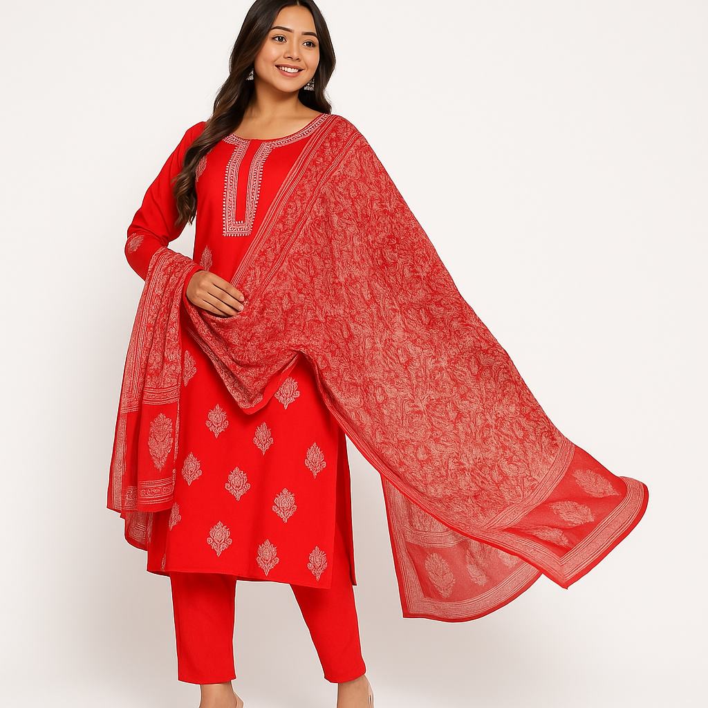 This elegant red rayon kurta set features fine handwork detailing and comes with a matching dupatta and bottom. Designed in breathable rayon fabric, it ensures both comfort and style. The kurta showcases traditional motifs, making it a perfect choice for festive gatherings, cultural events, and family occasions. The regular fit and vibrant color enhance your ethnic look effortlessly.