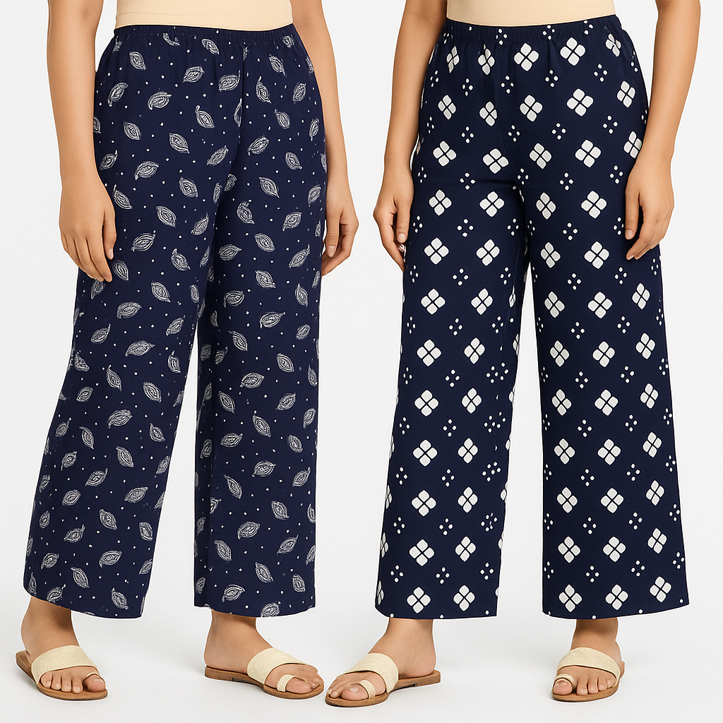 This combo pack includes 2 stylish floral printed palazzos designed for everyday comfort. Made with breathable and soft cotton-rayon rich fabric, these pants feature an elastic waistband for perfect fit and wide-leg style for relaxed movement. Ideal for daily wear, office, college, shopping, and home lounging. Trendy prints and vibrant colors make it a must-have wardrobe stapl