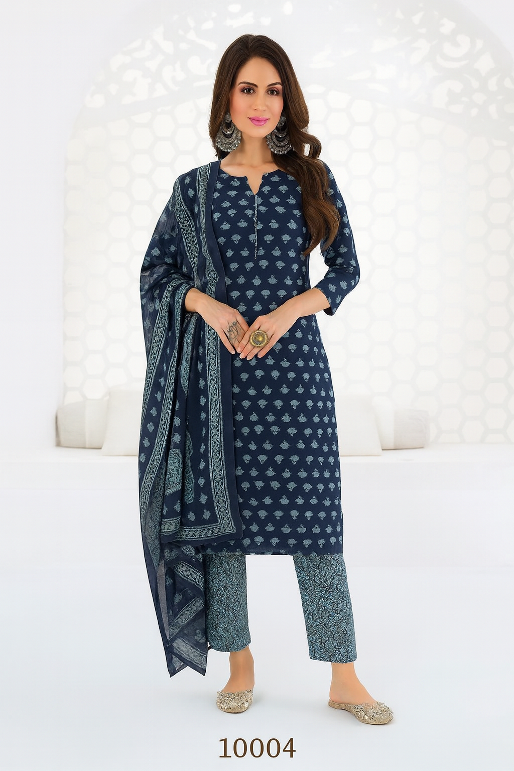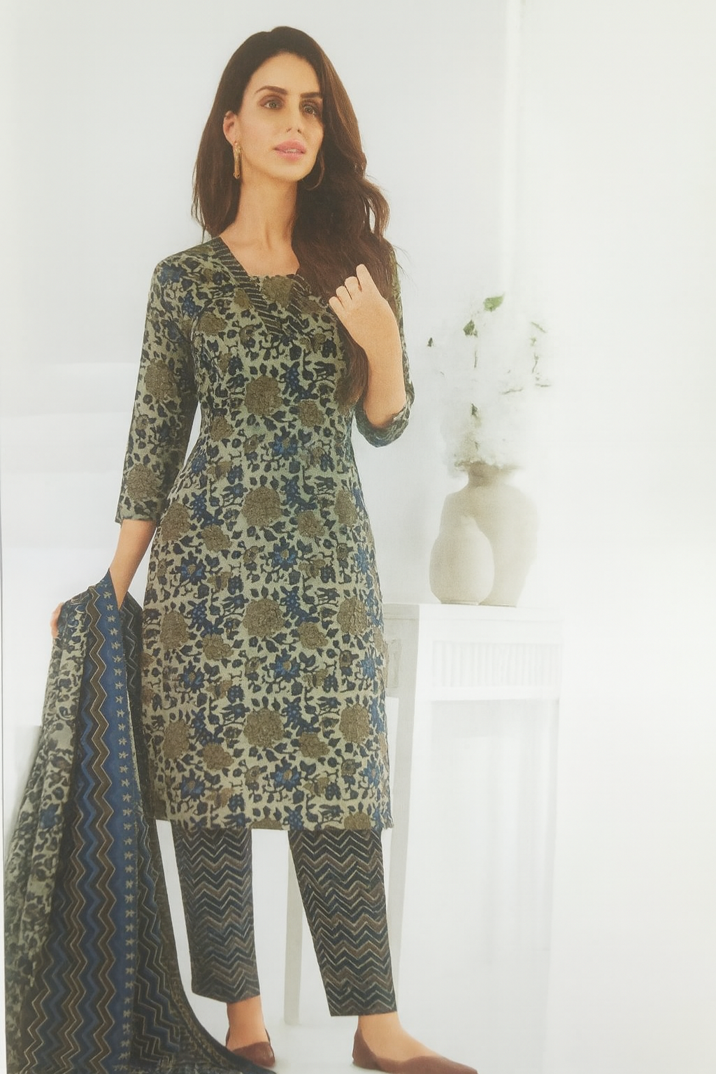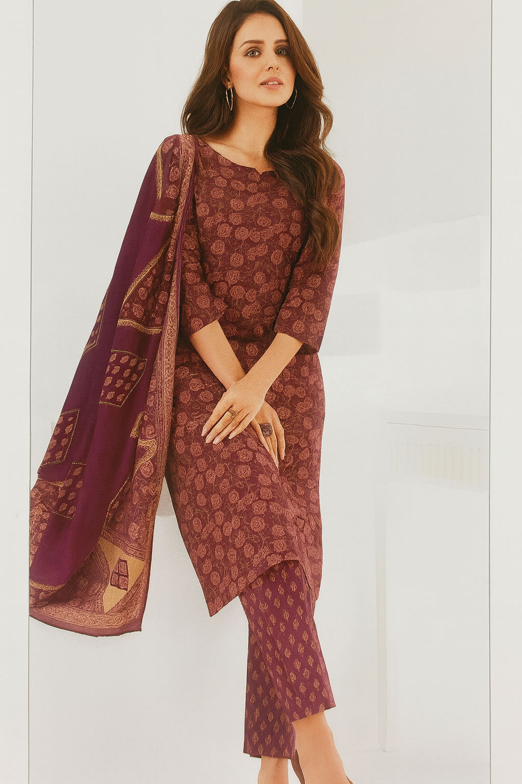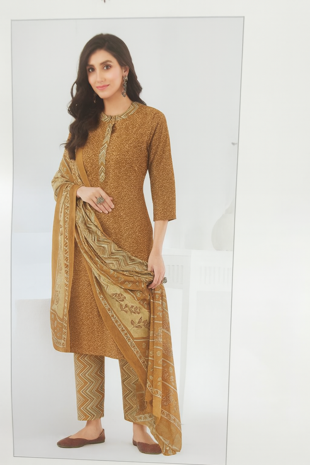 This elegant mustard brown kurta set comes with a beautifully printed dupatta and zig-zag patterned pant. Crafted from soft cotton blend fabric, it offers both comfort and style. The simple yet graceful design makes it perfect for festive occasions, office wear, or