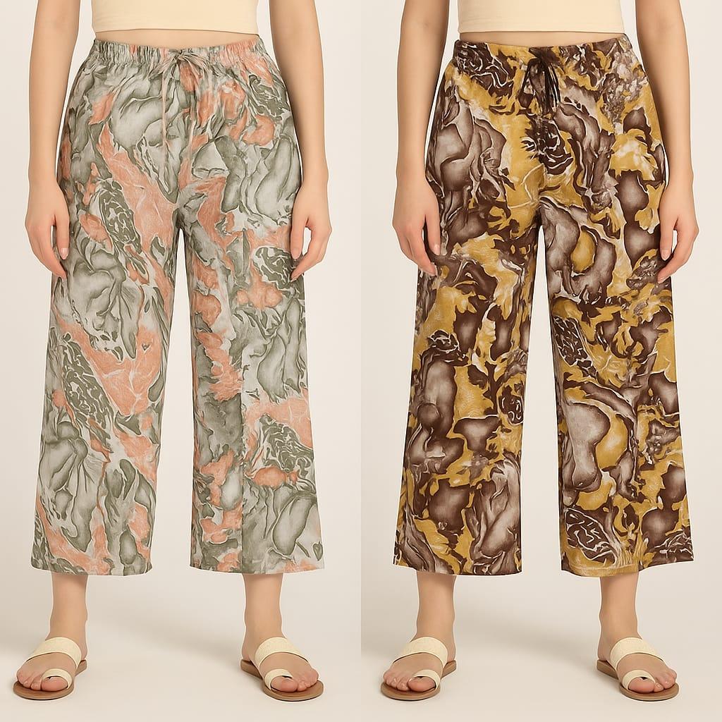This set of 2 wide-leg printed pants is crafted from soft, breathable rayon blend fabric, ensuring all-day comfort. Featuring unique abstract marble prints, these pants add a stylish flair to your casual wardrobe. The elasticated waistband with drawstring closure provides a perfect fit, while the relaxed wide-leg cut offers ease of movement. Ideal for pairing with tank tops, tees, or kurtis, making them perfect for casual outings, lounging at home, or vacation wear.
