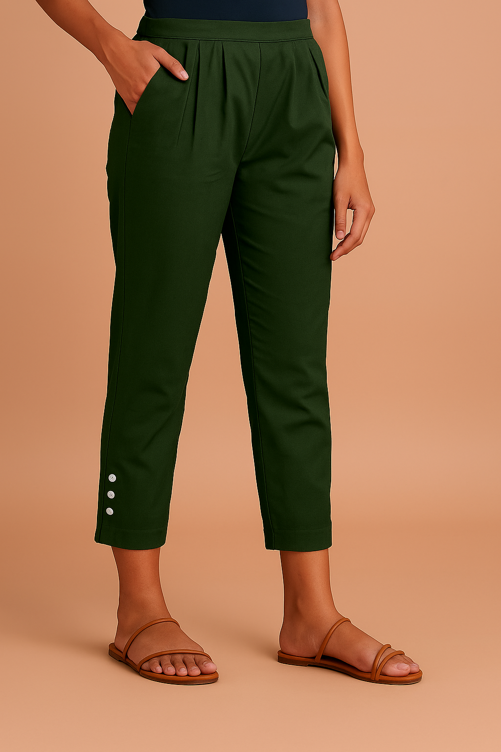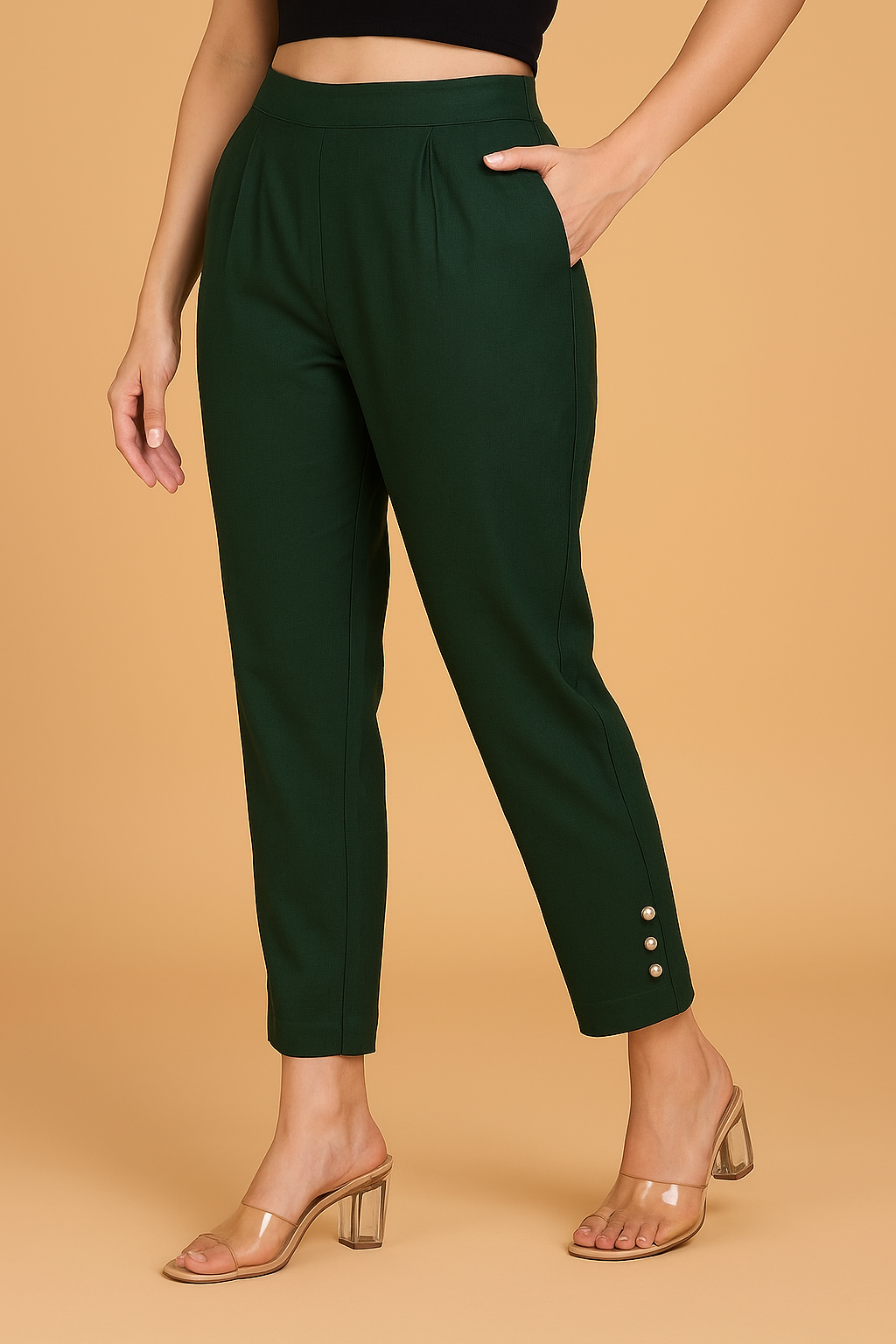 Elevate your everyday wardrobe with these elegant dark green straight-fit women's pants. Crafted from a soft and breathable poly crepe blend, they offer a flattering mid-rise waist and smooth finish for a sleek silhouette. Featuring a clean front, practical side pockets, and chic pearl-style buttons at the ankle, these pants bring both function and fashion together. Ideal for office wear or casual outings, pair them with a tucked-in blouse or crop top and heels for a polished look.