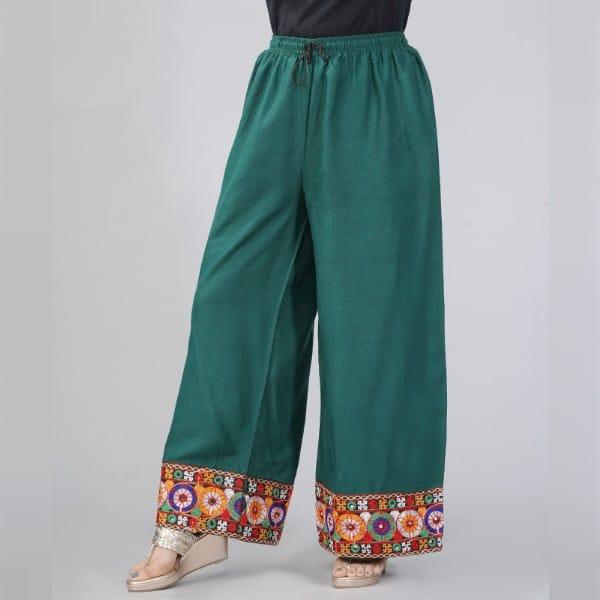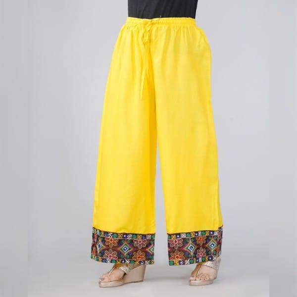 Bright red rayon palazzo pants featuring a comfortable elastic waistband and drawstring. The highlight is the beautiful multi-color traditional mirror work embroidery at the hem, adding a vibrant ethnic touch. Perfect for pairing with kurtas, tops, or tunics for casual and festive occasions.